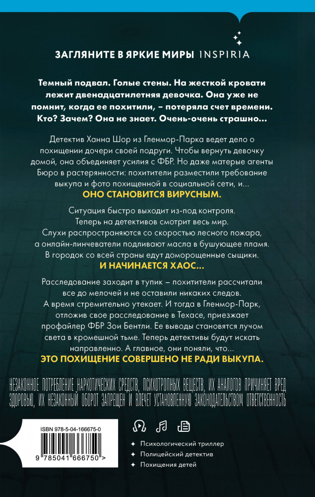 Расследование заходит в тупик — похитители рассчитали всё до мелочей и не оставили никаких следов. А время стремительно утекает. И тогда в Гленмор-Парк, отложив свое расследование в Техасе, приезжает профайлер ФБР Зои Бентли. Ее выводы становятся лучом света в кромешной тьме. Теперь детективы будут искать направленно. А главное, они поняли, что это похищение совершено не ради выкупа... |