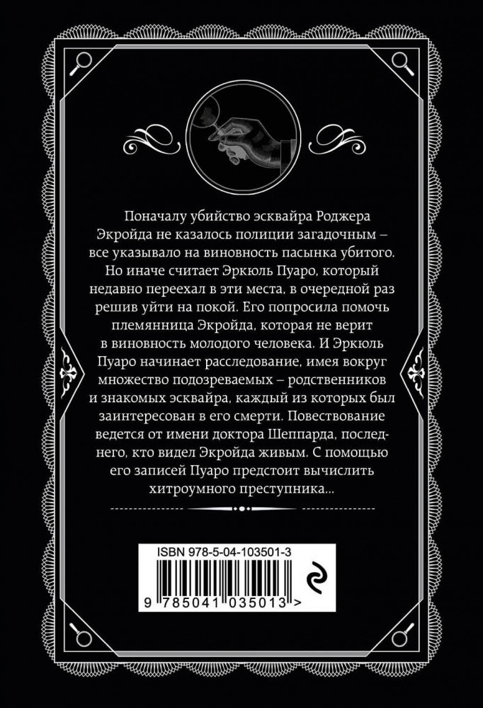 Поначалу убийство эсквайра Роджера Экройда не казалось полиции загадочным — все указывало на виновность пасынка убитого. Но иначе считает Эркюль Пуаро, который недавно переехал в эти места, в очередной раз решив уйти на покой. Его попросила помочь племянница Экройда, которая не верит в виновность молодого человека. И Эркюль Пуаро начинает расследование, имея вокруг множество подозреваемых — родственников и знакомых эсквайра, каждый из которых был заинтересован в его смерти. Повествование ведется от имени доктора Шеппарда, последнего, кто видел Экройда живым. С помощью его записей Пуаро предстоит вычислить хитроумного преступника...