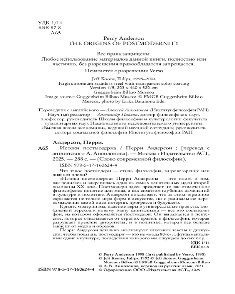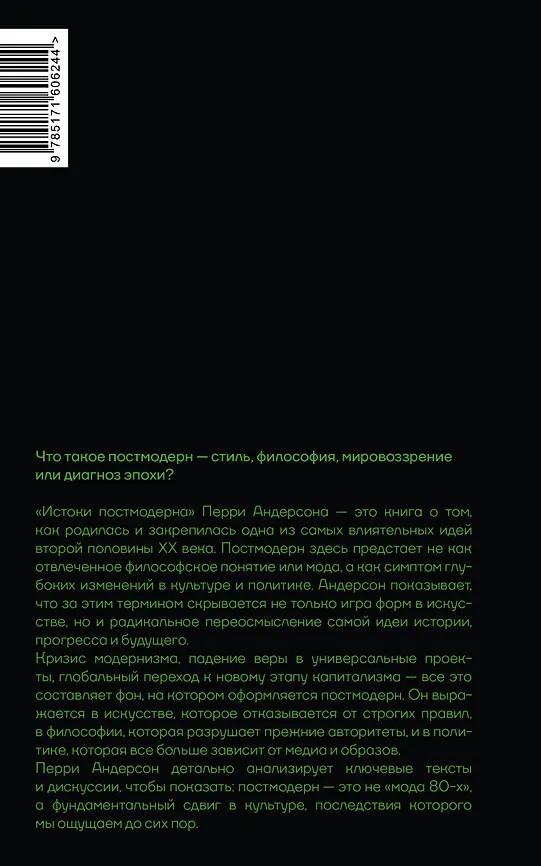 💳 Оплатить за товар можно при получении 🇰🇿 Есть бесплатная доставка по Казахстану 🎁 Копите бонусы с каждой покупки Серия: Слово современной философии Что такое постмодерн — стиль, философия, мировоззрение или диагноз эпохи? «Истоки постмодерна» Перри Андерсона — это книга о том, как родилась и закрепилась одна из самых влиятельных идей второй половины XX века. Постмодерн здесь предстает не как отвлеченное философское понятие или мода, а как симптом глубоких изменений в культуре и политике. Андерсон показывает, что за этим термином скрывается не только игра форм в искусстве, но и радикальное переосмысление самой идеи истории, прогресса и будущего. Кризис модернизма, падение веры в универсальные проекты, глобальный переход к новому этапу капитализма — всё это составляет фон, на котором оформляется постмодерн. Он выражается в искусстве, которое отказывается от строгих правил, в философии, которая разрушает прежние авторитеты, и в политике, которая всё больше зависит от медиа и образов. Перри Андерсон детально анализирует ключевые тексты и дискуссии, чтобы показать: постмодерн — это не «мода 80-х», а фундаментальный сдвиг в культуре, последствия которого мы ощущаем до сих пор. |