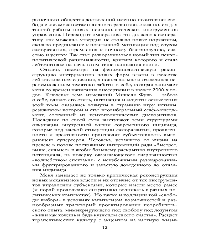 💳 Оплатить за товар можно при получении 🇰🇿 Есть бесплатная доставка по Казахстану 🎁 Копите бонусы с каждой покупки Серия: Российская академия Книга Алексея Соловьева — это исследование внутренней стороны современного неолиберального порядка, где власть перестает быть внешним принуждением и превращается в форму самоуправления через мотивацию, продуктивность и заботу о себе. Автор показывает, как на смену дисциплинарным обществам пришла эпоха психополитики, где человек становится «предпринимателем самого себя», а его внутренний мир — ареной управления. Внимание к себе, стремление к саморазвитию, культ креативности и гибкости превращаются в механизмы тонкого контроля и самоотчуждения, производя субъективность «выгоревшего супергероя», живущего в логике «ты можешь всё». |