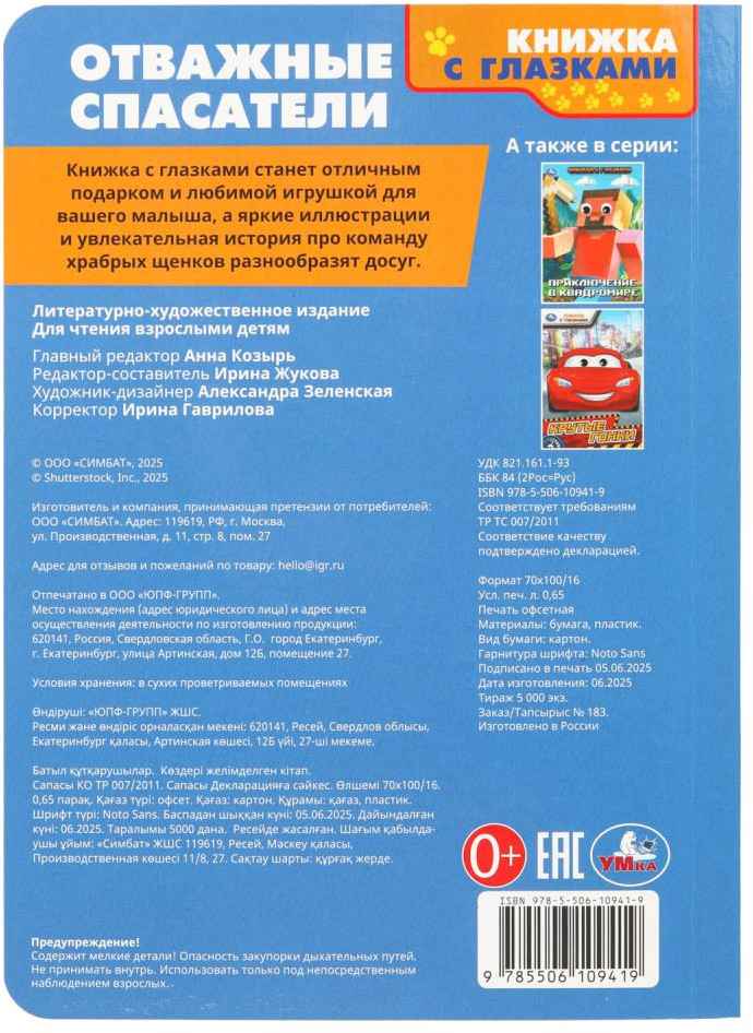 💳 Оплатить за товар можно при получении 🇰🇿 Есть бесплатная доставка по Казахстану от 1 дня 🎁 Копите бонусы с каждой покупки Серия: Щенячий патруль Книжка с глазками «Отважные спасатели» ТМ «УМка» — отличный подарок для любознательного малыша. Яркая книга с интересной историей про приключения щенков-спасателей непременно заинтересует ребёнка. Большие картинки и смешные подвижные глазки, благодаря которым персонаж выглядит совсем как живой, не оставят равнодушным маленького читателя и подарят ему много увлекательных минут игры с этой книгой. |