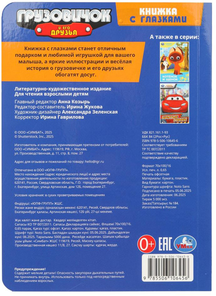 💳 Оплатить за товар можно при получении 🇰🇿 Есть бесплатная доставка по Казахстану от 1 дня 🎁 Копите бонусы с каждой покупки Книжка с глазками «Грузовичок и его друзья» ТМ «УМка» — отличный подарок для любознательного малыша. Яркая книга с интересной историей про приключения весёлых машинок непременно заинтересует ребёнка. Большие картинки и смешные подвижные глазки, благодаря которым персонаж выглядит совсем как живой, не оставят равнодушным маленького читателя и подарят ему много увлекательных минут игры с этой книгой. |