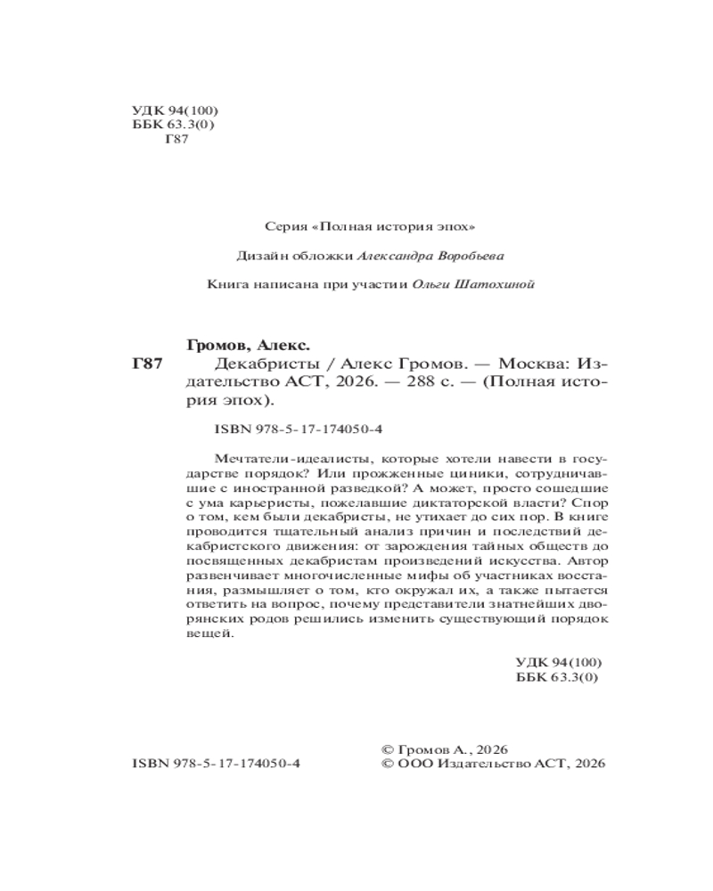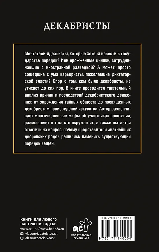💳 Оплатить за товар можно при получении 🇰🇿 Есть бесплатная доставка по Казахстану 🎁 Копите бонусы с каждой покупки Серия: Полная история эпох Мечтатели-идеалисты, которые хотели навести в государстве порядок? Или прожженные циники, сотрудничавшие с иностранной разведкой? А может, просто сошедшие с ума карьеристы, пожелавшие диктаторской власти? Спор о том, кем были декабристы, не утихает до сих пор. В книге проводится тщательный анализ причин и последствий декабристского движения: от зарождения тайных обществ до посвященных декабристам произведений искусства. Автор развенчивает многочисленные мифы об участниках восстания, размышляет о том, кто окружал их, а также пытается ответить на вопрос, почему представители знатнейших дворянских родов решились изменить существующий порядок вещей. |