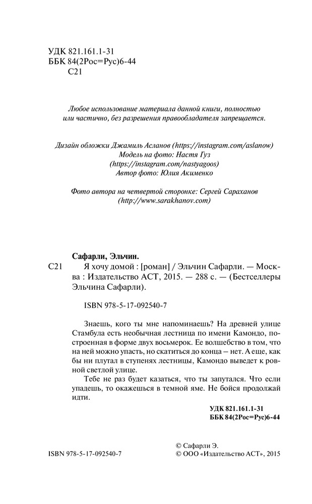 Я хочу домойВ данный момент этот товар отсутствует в продаже. Возможно, у нас найдется аналогичный или похожий товар здесь. Серия: Бестселлеры Эльчина Сафарли Знаешь, кого ты мне напоминаешь? На древней улице Стамбула есть необычная лестница по имени Камондо, построенная в форме двух восьмерок. Ее волшебство в том, что на ней можно упасть, но скатиться до конца — нет. А еще, как бы ни плутал в ступенях лестницы, Камондо выведет к ровной светлой улице. |
