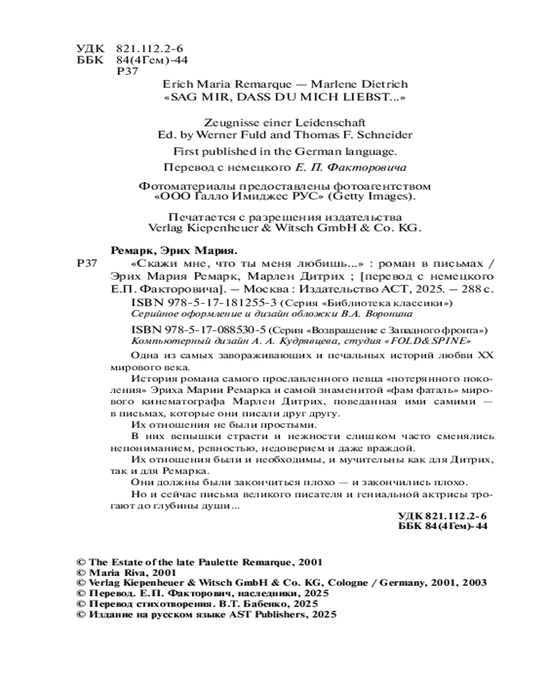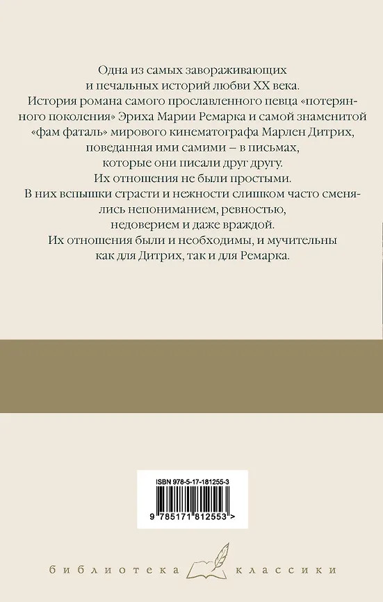 💳 Оплатить за товар можно при получении 🇰🇿 Есть бесплатная доставка по Казахстану 🎁 Копите бонусы с каждой покупки Серия: Библиотека классики Одна из самых завораживающих и печальных историй любви ХХ века. История романа самого прославленного певца «потерянного поколения» Эриха Марии Ремарка и самой знаменитой «фам фаталь» мирового кинематографа Марлен Дитрих, поведанная ими самими – в письмах, которые они писали друг другу. Их отношения не были простыми. В них вспышки страсти и нежности слишком часто сменялись непониманием, ревностью, недоверием и даже враждой. Их отношения были и необходимы, и мучительны как для Дитрих, так и для Ремарка. Они должны были закончиться плохо – и закончились плохо. Но и сейчас письма великого писателя и гениальной актрисы трогают до глубины души... |