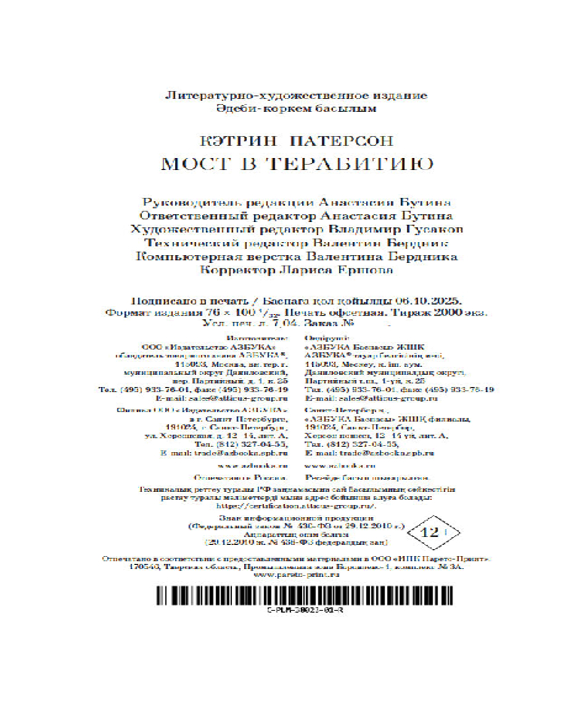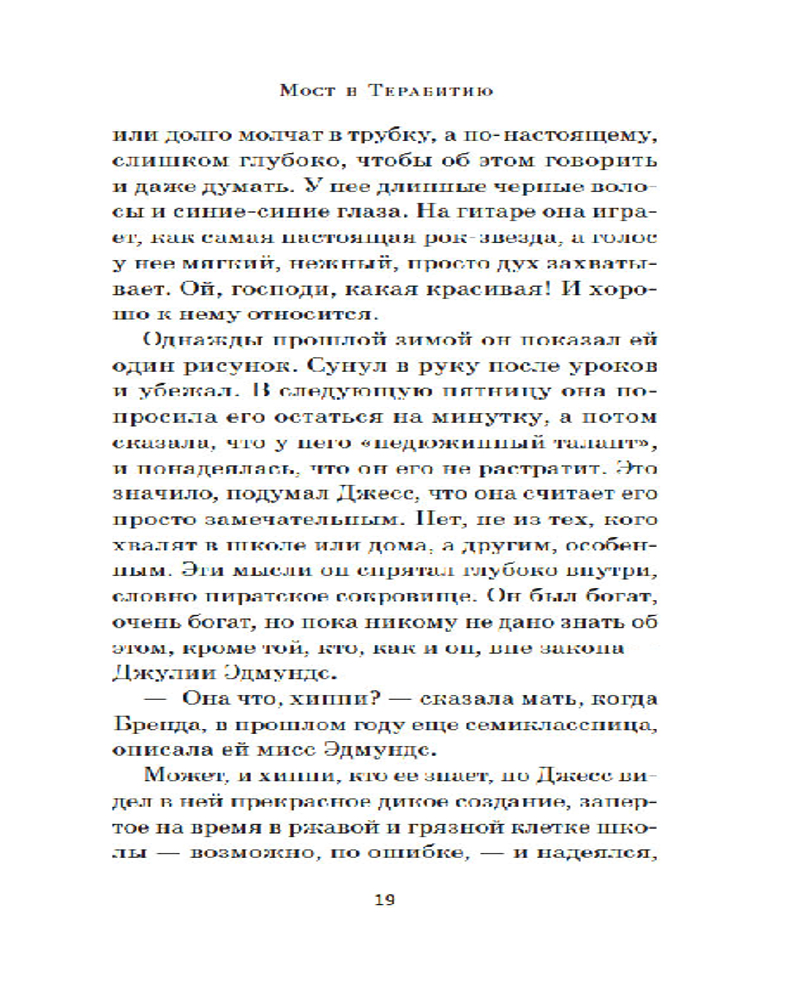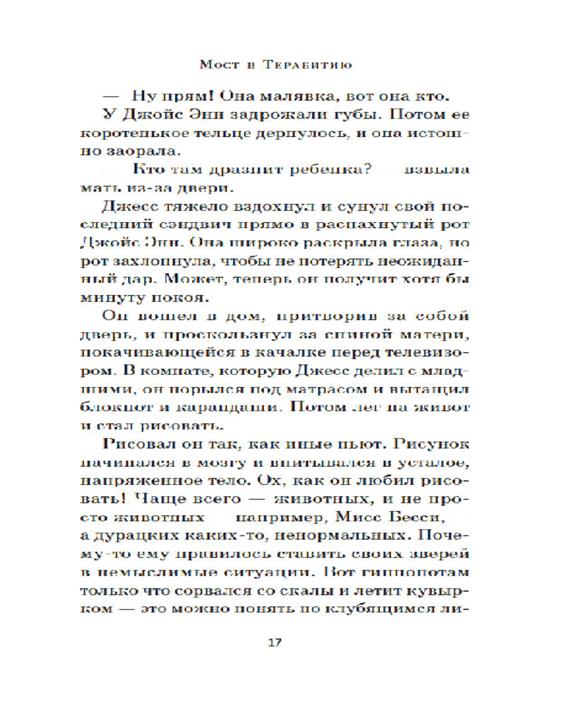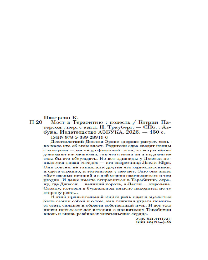 💳 Оплатить за товар можно при получении 🇰🇿 Есть бесплатная доставка по Казахстану от 1 дня 🎁 Копите бонусы с каждой покупки Серия: Азбука. Пульсации (мини) Десятилетний Джесси Эронс здорово рисует, только мало кто об этом знает. Родители едва сводят концы с концами — им не до фантазий сына, а сестры вечно донимают насмешками, так что с ними он и подавно не стал бы это обсуждать. Но вот однажды у Джесси появляется новая соседка — его сверстница Лесли Бёрк. Она совсем не такая, как другие его одноклассники: и одета странно, и телевизора у нее нет. Зато она знает уйму разных историй, и с ней можно разговаривать о чем угодно. И даже вместе отправиться в Терабитию, страну, где Джесси — великий король, а Лесли — королева. Страну, которая в буквальном смысле находится по ту сторону реки... |