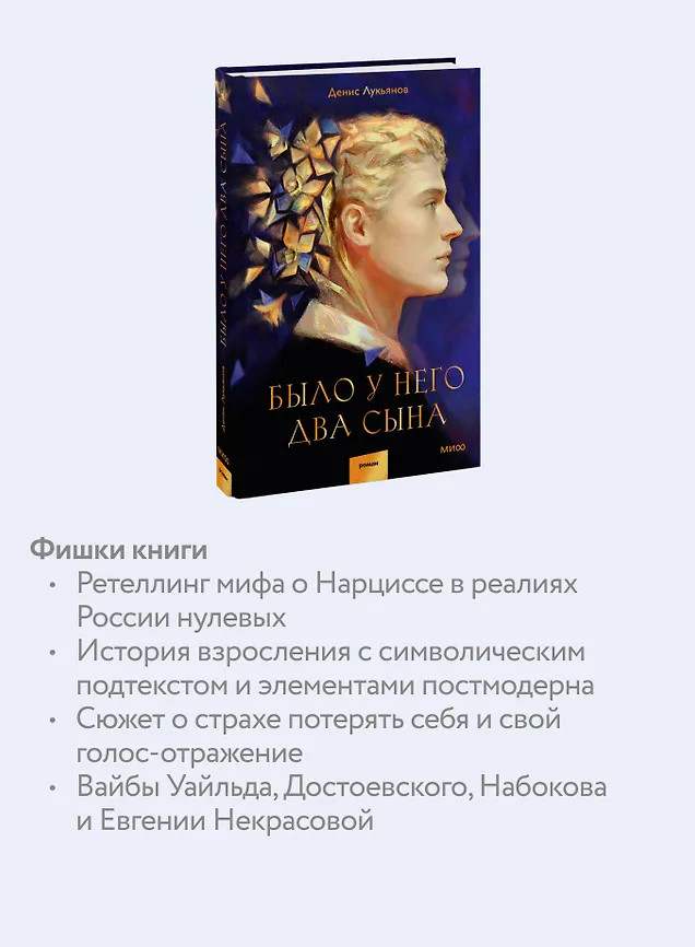 «Было у него два сына» — история о борьбе двух комиксистов, современное и мистическое переложение мифа о Нарциссе, а еще — сказок о двух братьях и двойниках. Текст задумывался зеркальным, здесь двоится и противопоставляется все: от персонажей до системы образов. Российская провинция соперничает с мегаполисом, мир суеверий с миром поп-культуры, няня-Василиса с бабкой-Медеей. Роман получился мистический, с вайбами Уайльда, Достоевского, Набокова и, пожалуй, Евгении Некрасовой. Он буквально нафарширован всякими отсылками: от таинственного доктора-Ананси до маленького Лужина. Но прежде всего это история о творческой зависимости, о неумении прорабатывать внутренние травмы, о мировой боли, которую слышит главный герой, дитя тысячелетия, рожденный в двухтысячном. А написано все это дело во втором лице. Почему? А кто может рассказать историю Нарцисса лучше, чем его отражение?