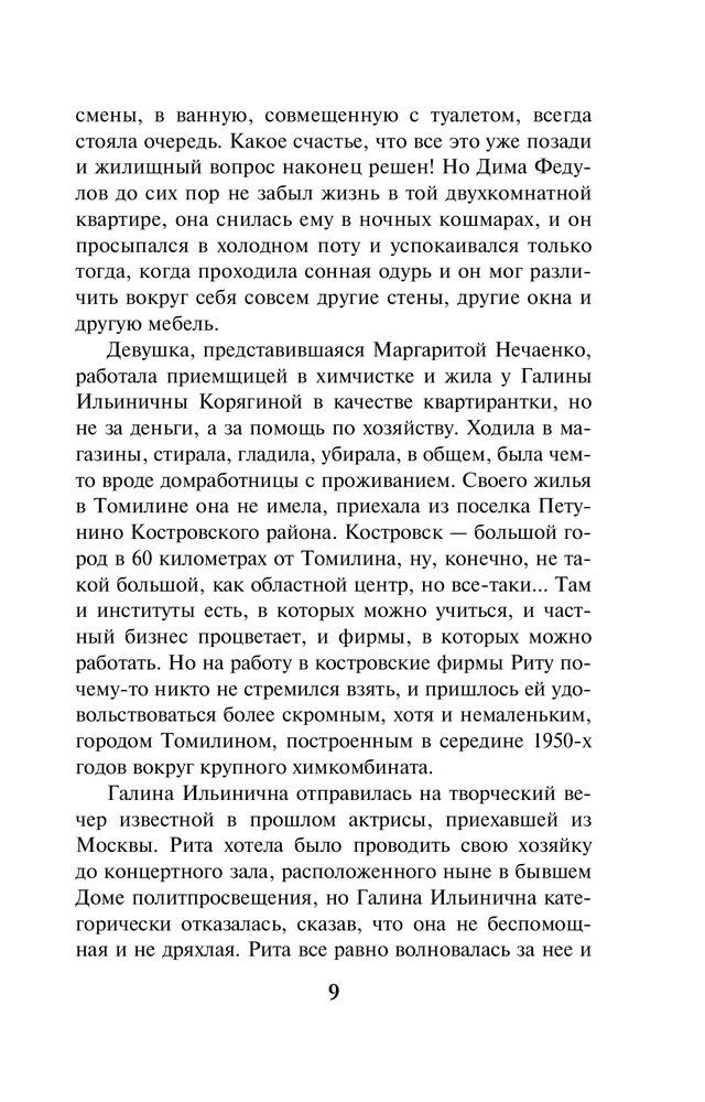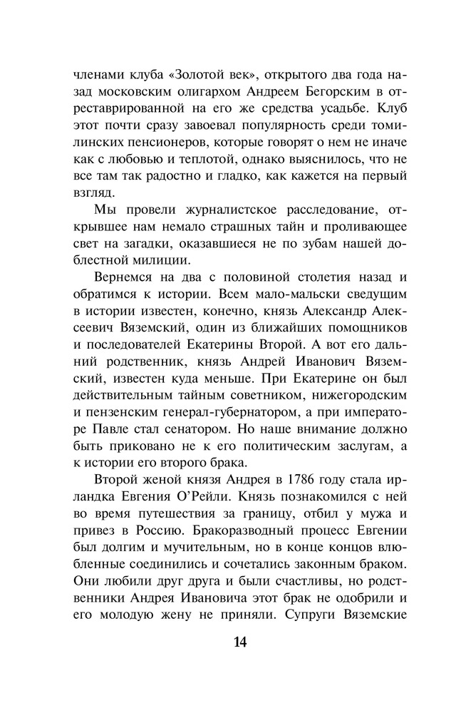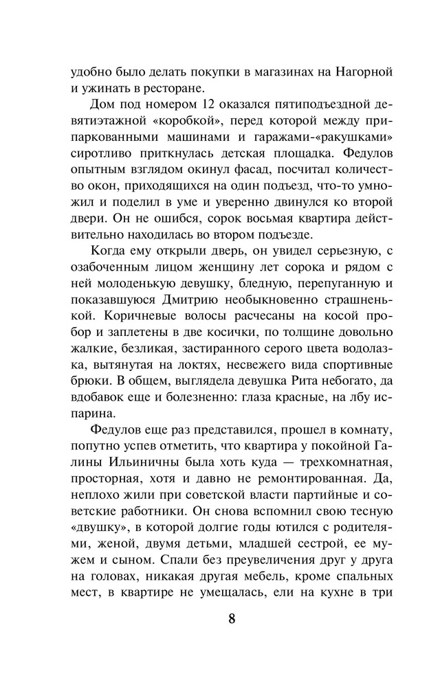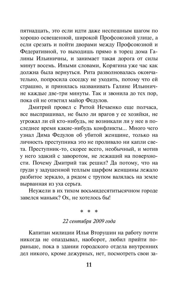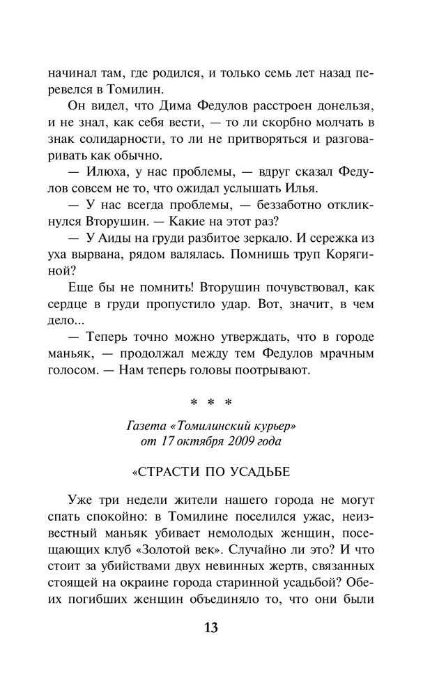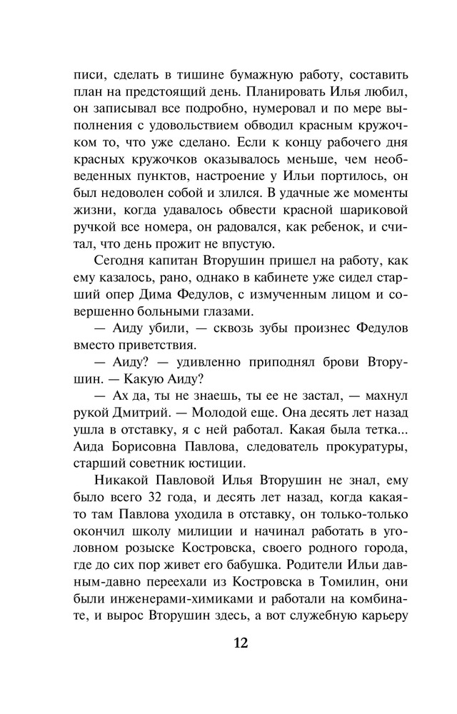 В данный момент этот товар отсутствует в продаже. Возможно, у нас найдется аналогичный или похожий товар здесь. Серия: А. Маринина. Больше чем детектив (обложка) Разбитое зеркальце на груди, сережка, вырванная из уха — своеобразная «визитная карточка» убийцы. Кто убил этих двух почтенных женщин — маньяк, одержимый мрачноватыми легендами рода Вяземских, или его изощренный имитатор? Все версии неизменно заходят в тупик. Бизнесмен, чьи начинания в связи с этими преступлениями находятся под угрозой, решил прибегнуть к помощи частного детектива. Так Анастасия Каменская оказалась в провинциальном Томилине. Да-да, полковник милиции в отставке Каменская теперь работает в частном детективном агентстве, и это расследование — ее дебют на данном поприще. Теперь за её спиной нет могущественного и влиятельного ведомства, и это как-то непривычно. Но от Насти по-прежнему требуется ее умение разговаривать и слушать, систематизировать факты, интуитивно — а это есть вершина ее «сыскного таланта» — выбирать верное направление поисков. Словом, открывать все двери, которые встречаются на ее пути. Ведь за одной из них находится истина. Она-то неподвластна никаким переменам. |