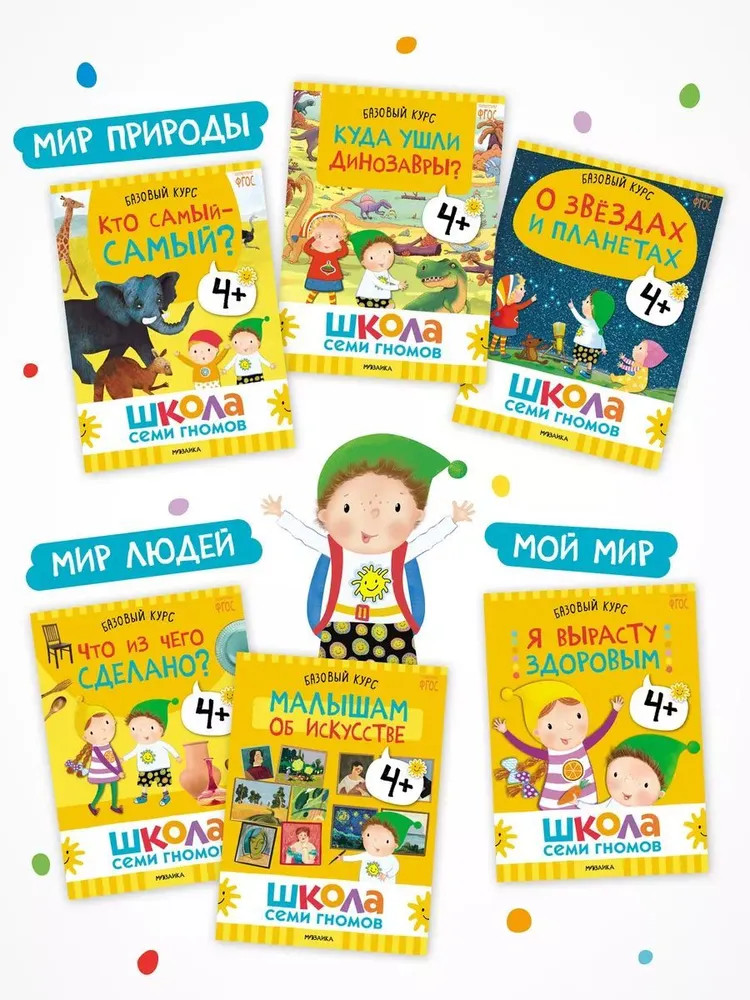 В данный момент этот товар отсутствует в продаже. Возможно, у нас найдется аналогичный или похожий товар здесь. Серия: Школа Семи Гномов. Новый базовый курс Годовой базовый курс. Комплект 4+ (Школа Семи Гномов. Базовый курс), 12 книг + развивающие материалы. Школа Семи Гномов – это система, а не набор книг. Комплекс из 12 книг направлен на всестороннее развитие ребенка. 6 книг для развития когнитивных способностей: познавательный интерес, умение думать, анализировать, делать выводы. И еще 6 книг для знакомства с окружающим миром, его закономерностями и взаимосвязями.