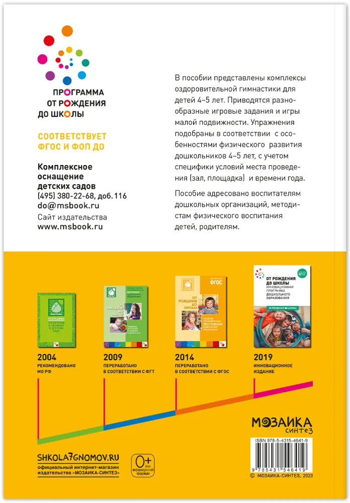 💳 Оплатить за товар можно при получении 🇰🇿 Есть бесплатная доставка по Казахстану 🎁 Копите бонусы с каждой покупки Серия: От рождения до школы В пособии представлены комплексы оздоровительной гимнастики для детей 4-5 лет. Приводятся разнообразные игровые задания и игры малой подвижности. Упражнения подобраны в соответствии с особенностями физического развития дошкольников 4-5 лет, с учетом специфики условий места проведения (зал, площадка) и времени года. Пособие адресовано воспитателям дошкольных организаций, методистам физического воспитания детей, родителям. |