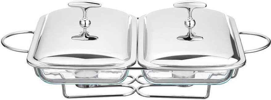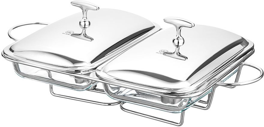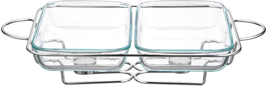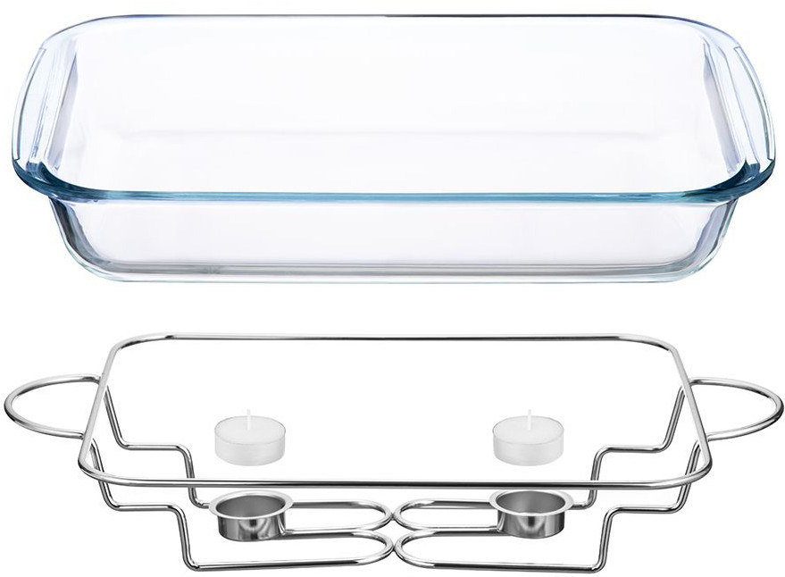 Набор 2 прямоугольных мармитов с крышками от бренда Elan Gallery — это элегантное решение для подачи тёплых блюд на стол. Общий размер комплекта — 48×29,8×17 см. Объём каждой жаропрочной ёмкости — 1,5 литра, размер каждой — 29,5×17,5×5 см. Внутренний размер каждого блюда 25,5×16×4 см. Красивая сервировочная посуда сочетает в себе функциональность и изысканный дизайн: снизу ёмкости подогреваются двумя свечами (поставляются в комплекте), чтобы поддерживать температуру пищи. Формы выполнены из жаропрочного стекла, крышки и подставка — из нержавеющей стали.