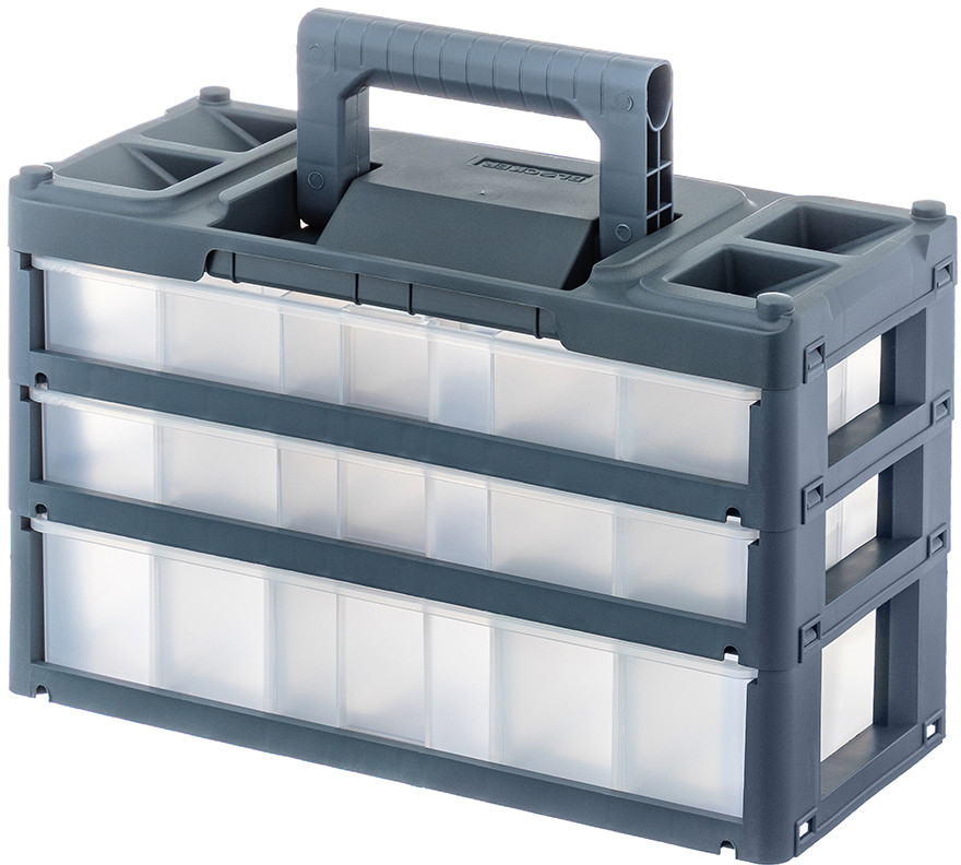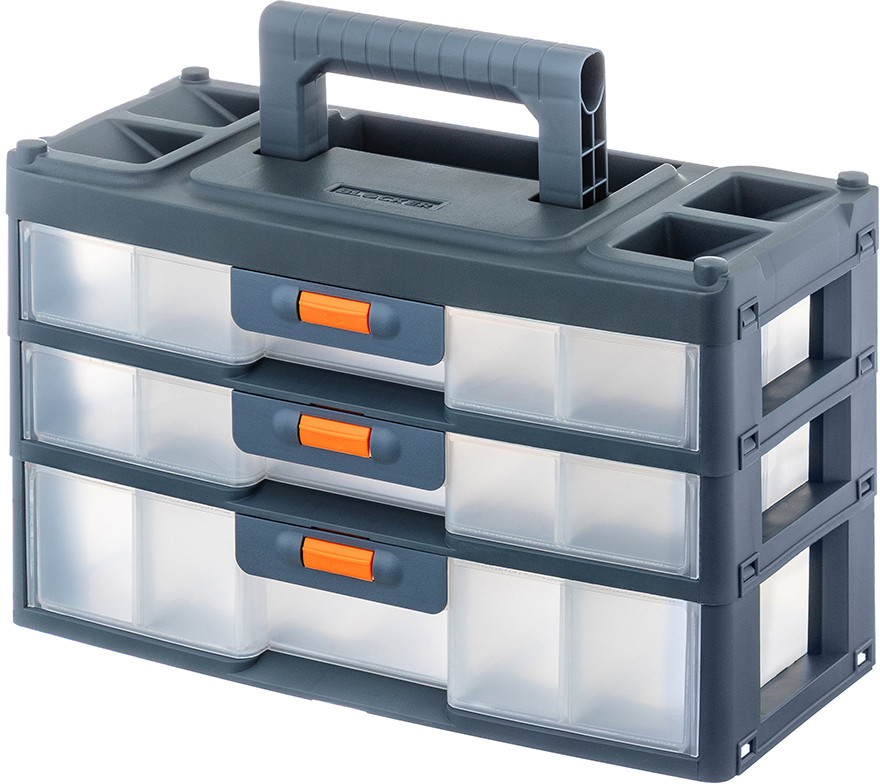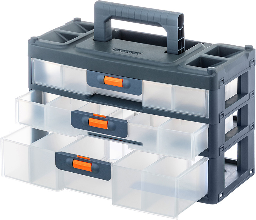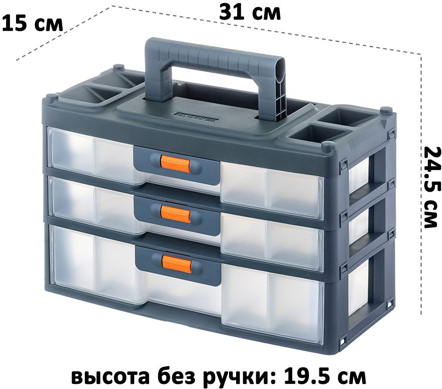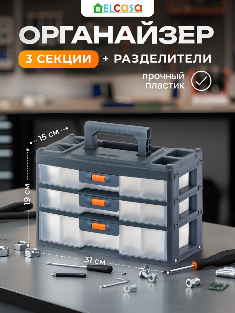 Настольный трёхсекционный органайзер от El Casa — это универсальное решение для хранения самых разнообразных мелочей и инструментов, например, болтов, саморезов и гаек. Имеет ручку, поэтому удобен для переноса. Выполнен из полипропилена — прочного экологичного пластика. Размер с опущенной ручкой 31×15×19,5 см, высота с поднятой ручкой 24,5 см. Каждая из 3 секций представляет собой ящик, который плотно защёлкивается. Чтобы открыть каждый, нужно нажать и удерживать оранжевую кнопку. 2 верхних ящика имеют внутри по 3 отделения (одно размером 13,5×8,5×4 см, два по 14×10×4 см). 1 нижний ящик имеет одно большое отделение размером 28×14×6 см.