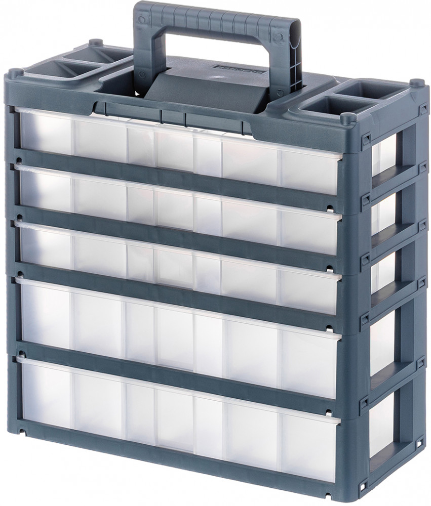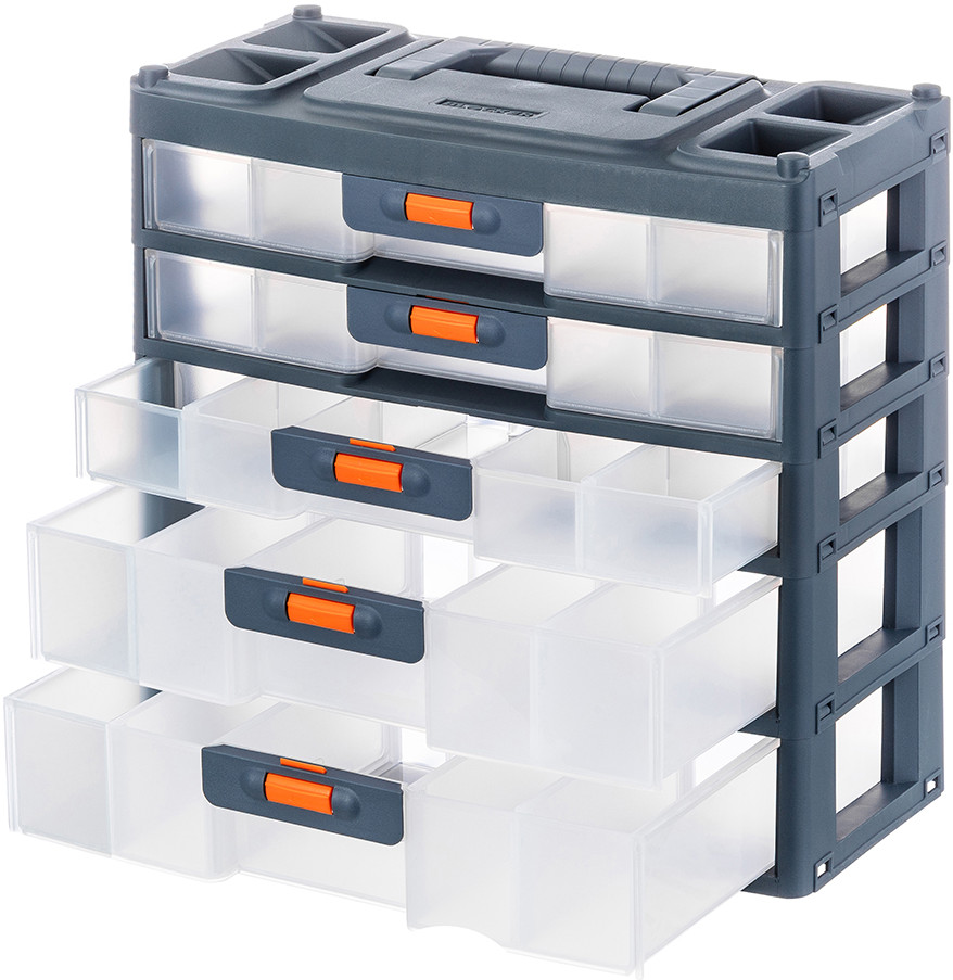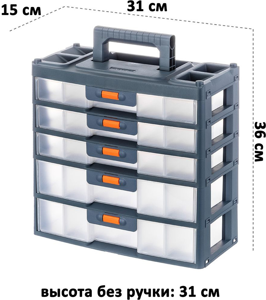 Настольный пятисекционный органайзер от El Casa — это универсальное решение для хранения самых разнообразных мелочей и инструментов, например, болтов, саморезов и гаек. Имеет ручку, поэтому удобен для переноса. Выполнен из полипропилена — прочного экологичного пластика. Размер с опущенной ручкой 31×15×31 см, высота с поднятой ручкой 36 см. Каждая из 5 секций представляет собой ящик, который плотно защёлкивается. Чтобы открыть каждый, нужно нажать и удерживать оранжевую кнопку. 3 верхних ящика имеют внутри по 3 отделения (одно размером 13,5×8,5×4 см, два по 14×10×4 см). 2 нижних ящика имеют по одному большому отделению размером 28×14×6 см.