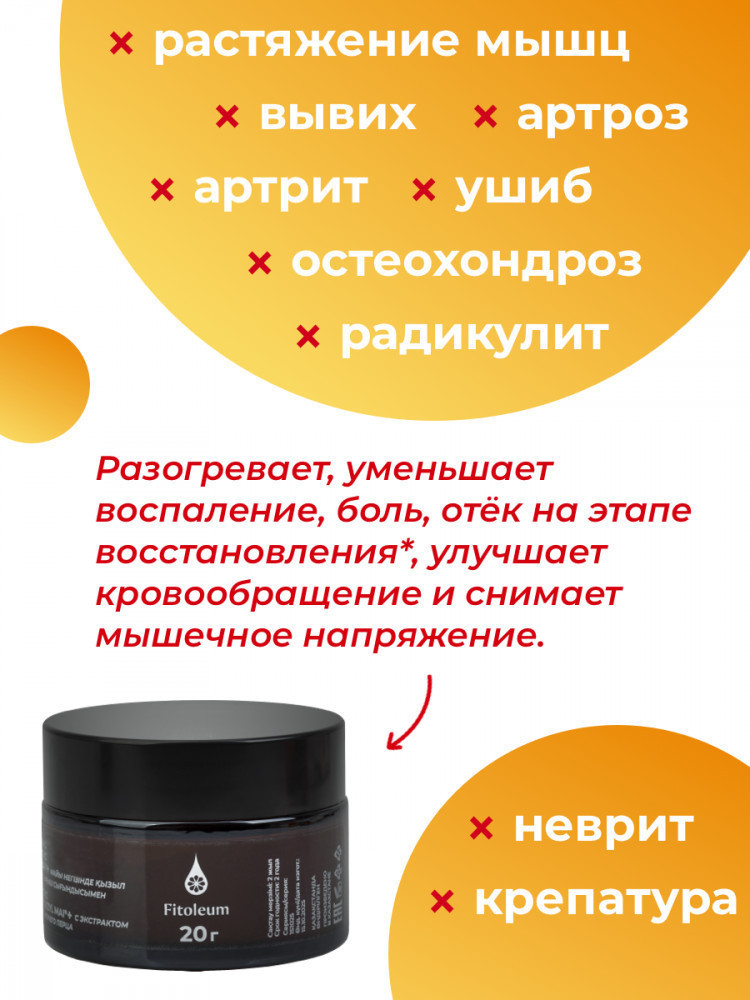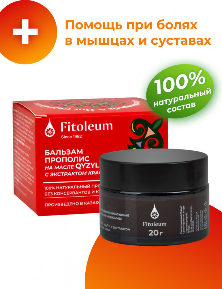 Бальзам Прополис на масле Кызыл май + с экстрактом красного жгучего перца — лечебная разогревающая мазь для снятия боли в мышцах и суставах, при заболеваниях опорно-двигательного аппарата (при хронических болях, связанных с артрозом, артритом, остеохондрозом и радикулитом), при восстановлении после травм (при растяжении, ушибах, вывихе, чтобы ускорить рассасывание синяков и снять остаточные боли), для снятия мышечного напряжения (помогает снять дискомфорт, напряжение, крепатура), при неврите, для профилактики переохлаждения и растяжения мышц перед нагрузкой (подходит для массажа и согревающего эффекта). Комбинация прополиса, масла Кызыл май +, созданного компанией Фитолеум по оригинальной технологии из 8 лекарственных трав, и жгучего красного перца эффективно уменьшает воспаление, боль, отёк, ускоряет восстановление после травм, улучшает кровообращение и снимает мышечное напряжение. Не содержит гормонов, антибиотиков, консервантов и красителей.