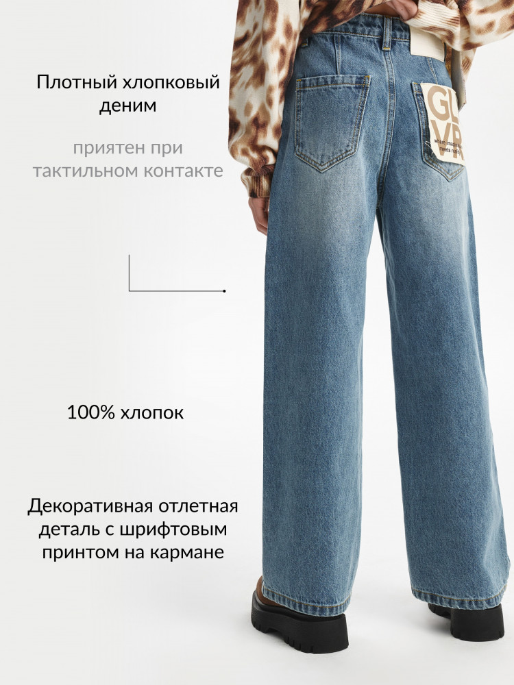 Голубые джинсы силуэта палаццо с высокой посадкой станут неотъемлемым элементом стильного и практичного осеннего гардероба девочки. Джинсы выполнены из плотного хлопкового денима с потертостями и варкой. Джинсы имеют четыре кармана. На заднем кармане нашита декоративная отлетная деталь с лаконичным шрифтовым принтом, служащая модным и оригинальным акцентом. Джинсы застёгиваются на молнию и пуговицу.