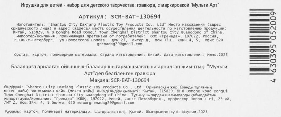 💳 Оплатить за товар можно при получении 🇰🇿 Есть бесплатная доставка по Казахстану от 1 дня 🎁 Копите бонусы с каждой покупки Набор для творчества — гравюра «Бэтмен» ТМ «Мульти Арт» — отличный подарок для ребёнка, который будет способствовать развитию его творческих способностей. С помощью данного набора юный художник сможет создать эффектную золотистую картину на чёрном фоне. Контур рисунка уже нанесён на основу, остаётся только процарапать изображение специальным штихелем. Можно не повторять каждую черточку, главное — соблюдать направление штриха! Готовая поделка станет отличным вариантом для подарка близким или для украшения интерьера комнаты. Занятия с наборами для творчества ТМ «Мульти Арт» развивают: внимание, усидчивость, творческое мышление, моторику рук и воображение. |