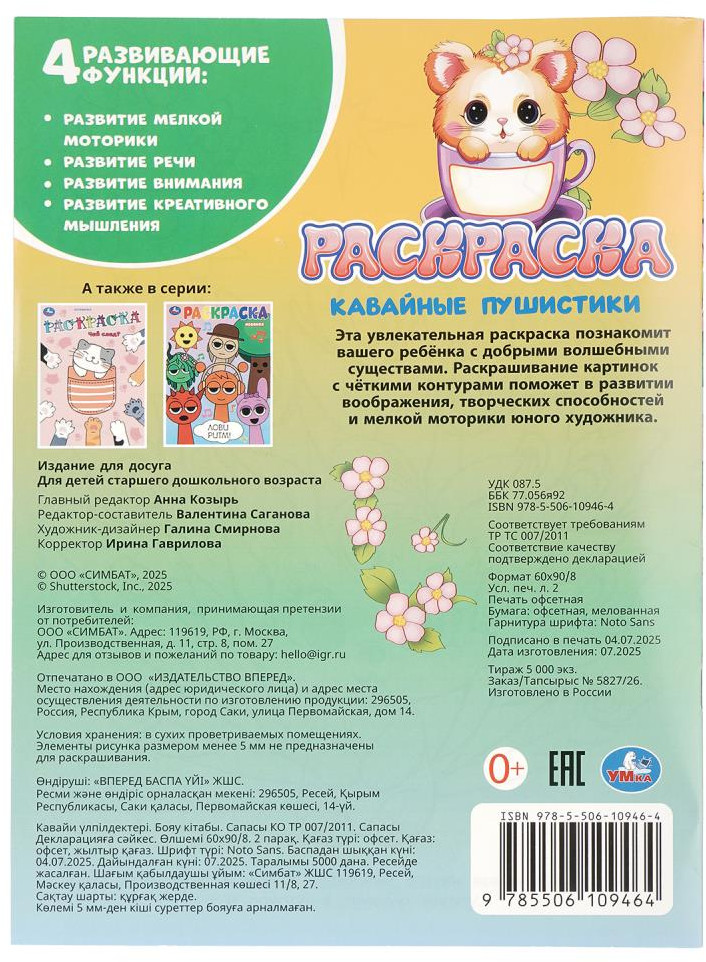 💳 Оплатить за товар можно при получении 🇰🇿 Есть бесплатная доставка по Казахстану от 1 дня 🎁 Копите бонусы с каждой покупки Раскраска «Кавайные пушистики» ТМ «УМка» — отличный подарок для юных художников:. Эта увлекательная раскраска про милых пушистых персонажей непременно понравится вашему ребёнку. В ней он найдёт интересные картинки с чёткими контурами и сюжетными текстами к ним. Данное издание станет отличным вариантом, чтобы взять его с собой в путешествие и скоротать время в дороге за раскрашиванием. |