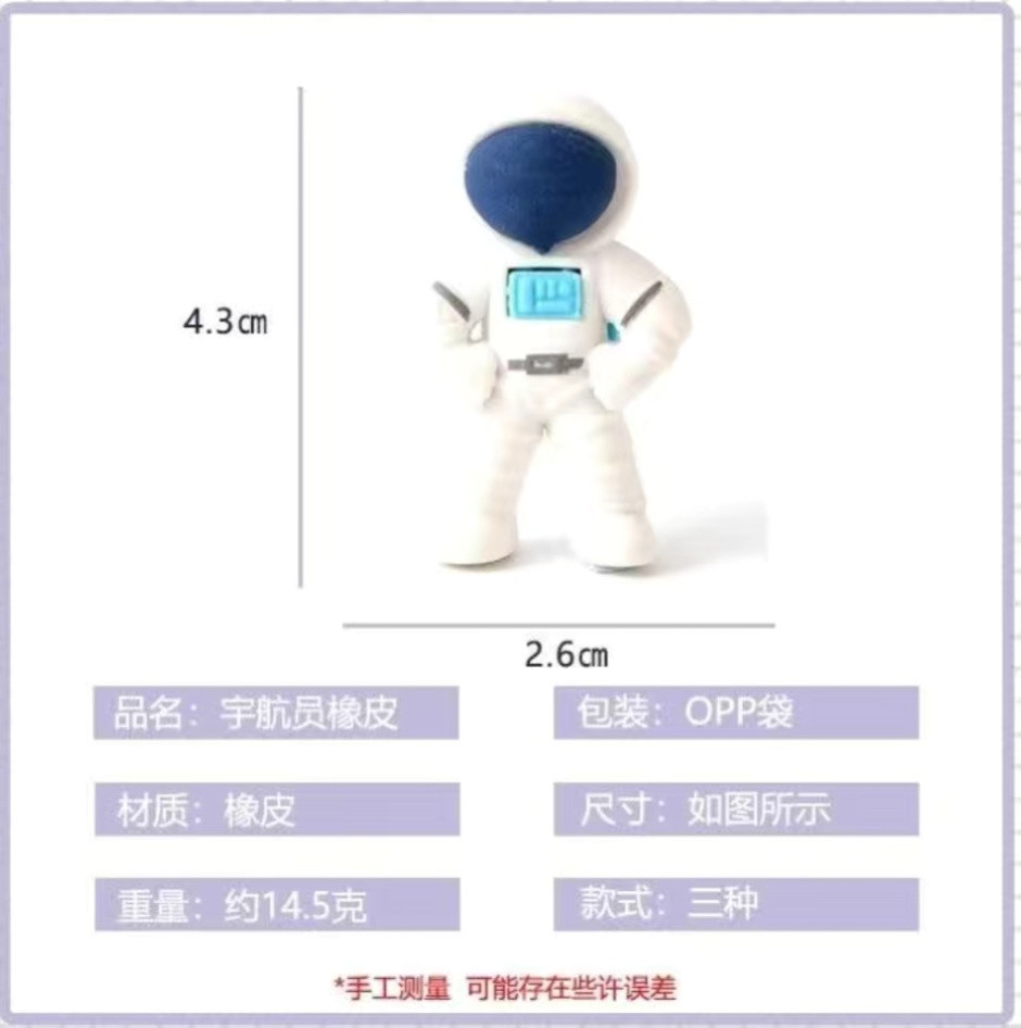 💳 Оплатить за товар можно при получении 🇰🇿 Есть бесплатная доставка по Казахстану от 1 дня 🎁 Копите бонусы с каждой покупки Фигурный ластик Астронавт. В наборе 3 штуки. Ластик предназначен для удаления надписей, сделанных чернографитным карандашом. Можно также использовать в качестве игрушки |