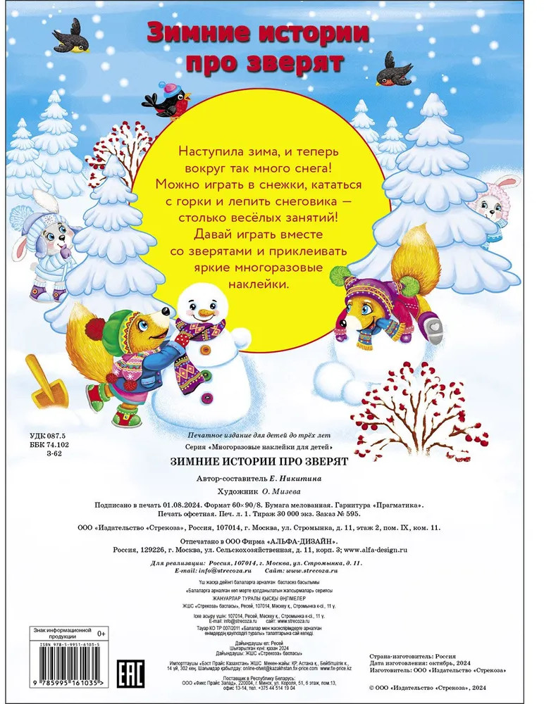 💳 Оплатить за товар можно при получении 🇰🇿 Есть бесплатная доставка по Казахстану 🎁 Копите бонусы с каждой покупки Серия: Многоразовые наклейки Наступила зима, и теперь вокруг так много снега! Можно играть в снежки, кататься с горки и лепить снеговика — столько веселых занятий! Давай играть вместе со зверятами и приклеивать яркие многоразовые наклейки. |