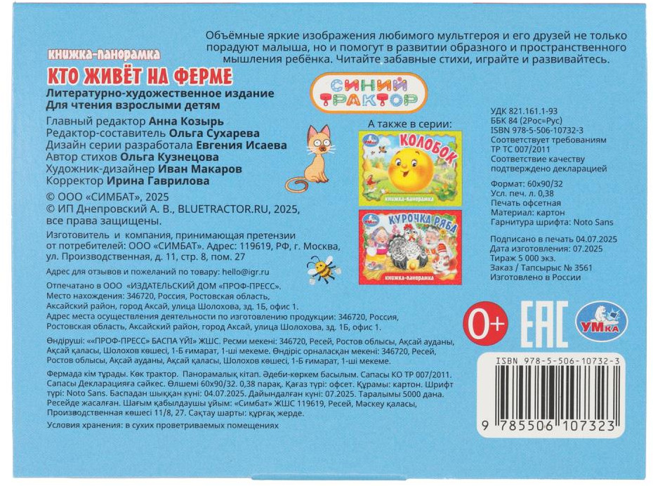 💳 Оплатить за товар можно при получении 🇰🇿 Есть бесплатная доставка по Казахстану 🎁 Копите бонусы с каждой покупки Серия: Синий трактор Книжка-панорамка для малышей «Синий Трактор. Кто живёт на ферме» ТМ «УМка» — отличный подарок для маленьких любознаек. Малыш с удовольствием будет листать яркие странички, рассматривать объёмные картинки-панорамки и слушать весёлые стихи про обитателей фермы. Читая вместе с родителями эту занимательную книгу, ребёнок будет расширять словарный запас и кругозор. Благодаря компактному (карманному) размеру книгу удобно брать с собой в дорогу. |