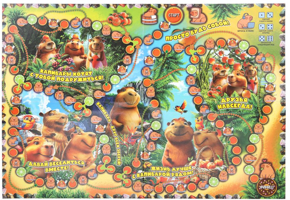 💳 Оплатить за товар можно при получении 🇰🇿 Есть бесплатная доставка по Казахстану от 1 дня 🎁 Копите бонусы с каждой покупки Настольная игра-ходилка на блистере «Милые друзья» ТМ «Умные игры» приглашает отправиться навстречу весёлым приключениям вместе с забавными капибарами! |
