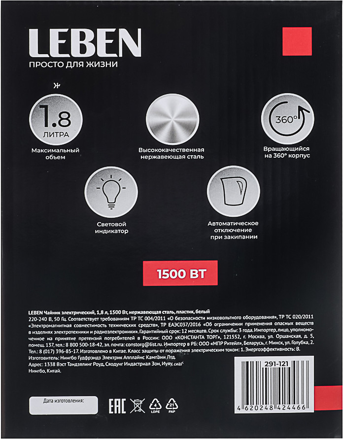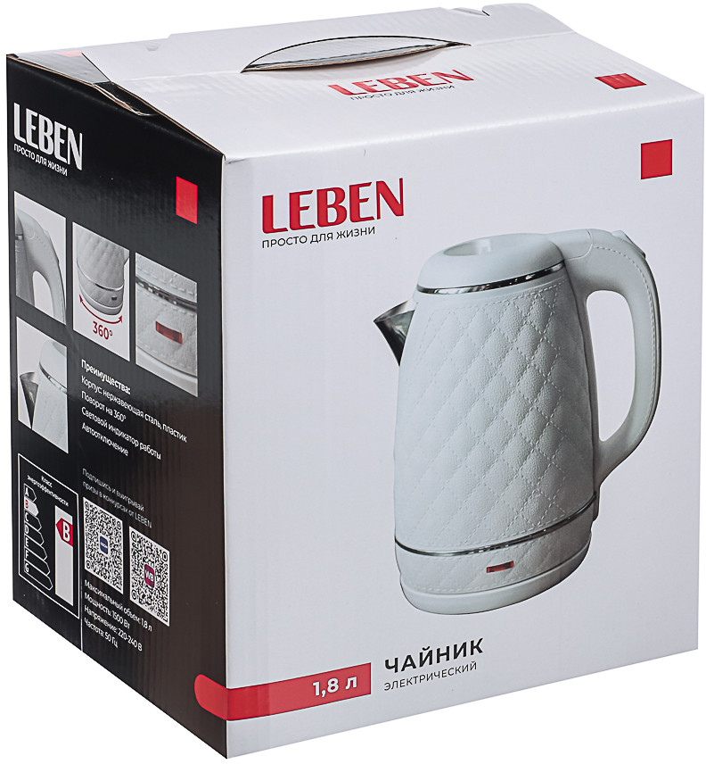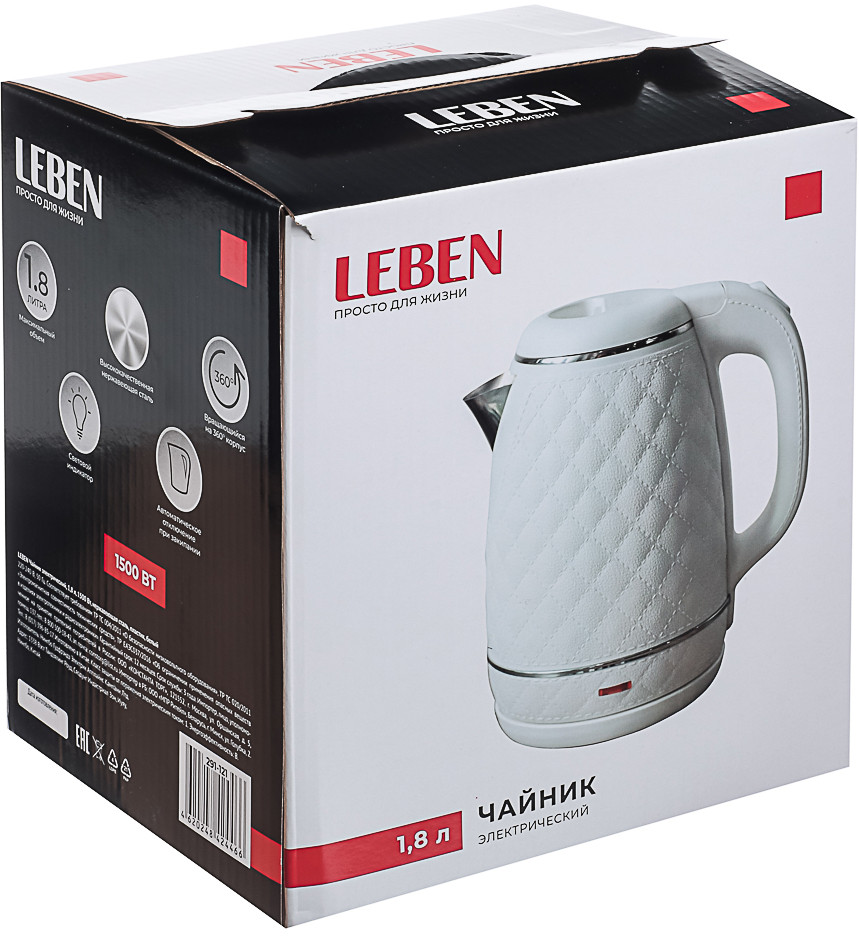 💳 Оплатить за товар можно при получении 🇰🇿 Есть бесплатная доставка по Казахстану от 1 дня 🎁 Копите бонусы с каждой покупки Электрический чайник Leben — это стильный и функциональный прибор для кипячения воды. Он имеет объём 1.8 литра и мощность 1500 Вт, что позволяет быстро нагреть воду. Корпус чайника выполнен из нержавеющей стали и пластика, что обеспечивает долговечность и устойчивость к коррозии. Белый цвет придаёт изделию элегантный вид. Автоматическое отключение при закипании гарантирует безопасность использования. Световой индикатор работы информирует о том, что чайник находится в рабочем состоянии. Поворот корпуса на 360 градусов делает его удобным в использовании. Этот электрический чайник станет незаменимым помощником на кухне и позволит наслаждаться горячим чаем или кофе в любое время. |
