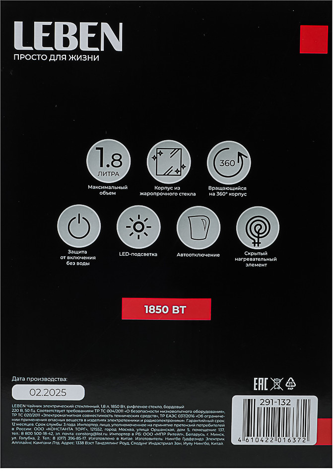 💳 Оплатить за товар можно при получении 🇰🇿 Есть бесплатная доставка по Казахстану от 1 дня 🎁 Копите бонусы с каждой покупки Электрический чайник из рифленого стекла 1.8 л — элегантное решение для современной кухни, где важны и функциональность, и эстетика. Бордовый корпус из прочного стекла с оригинальной текстурой придает прибору благородный вид, превращая процесс кипячения воды в визуально приятное действие. Модель сочетает в себе передовые технологии и продуманную эргономику. Интеграция скрытого нагревательного элемента обеспечивает не только быстрый нагрев, но и простоту в уходе, исключая проблему накипи. Конструкция с поворотным механизмом на 360 градусов делает использование максимально удобным, позволяя устанавливать чайник в любом положении на столешнице. Безопасность эксплуатации гарантируют интеллектуальные системы защиты, включая автоматическое отключение при достижении кипения и блокировку работы при недостаточном уровне воды. |