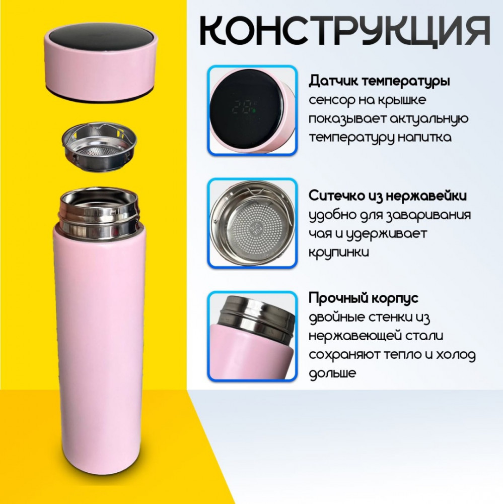 Термос с индикатором температурыВ данный момент этот товар отсутствует в продаже. Возможно, у нас найдется аналогичный или похожий товар здесь. Термос с датчиком температуры и ситечком, 500 мл. Термос с индикатором температуры — стильный и удобный аксессуар для дома, офиса и путешествий. Показывает актуальную температуру напитка и надолго сохраняет тепло или холод. |