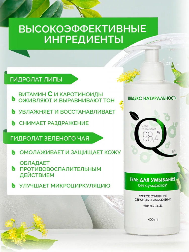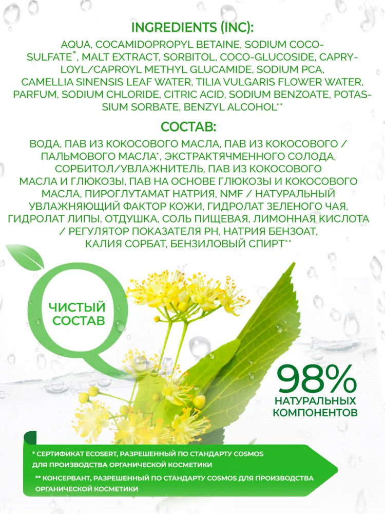Гель для умывания: Aqua (вода), Cocamidopropyl Betaine (ПАВ из кокосового масла), Sodium Coco-sulfate (ПАВ из кокосового масла), Malt Extract (экстракт солода), Sorbitol (сорбитол/увлажнитель), Coco-Glucoside (ПАВ из кокосового масла), Capryloyl/Caproyl Methyl Glucamide (ПАВ на основе глюкозы), Sodium PCA (увлажняющая аминокислота), Camellia Sinensis Leaf Water (гидролат зеленого чая), Tilia Platyphyllos Flower Water (гидролат липы), Parfum (отдушка), Sodium Chloride (соль пищевая), Citric Acid (лимонная кислота/регулятор показателя pH), Sodium Benzoate (бензоат натрия), Potassium Sorbate (калия сорбат), Benzyl Alcohol (бензиловый спирт) — консерванты, разрешенные по стандартам COSMOS для производства органической косметики.