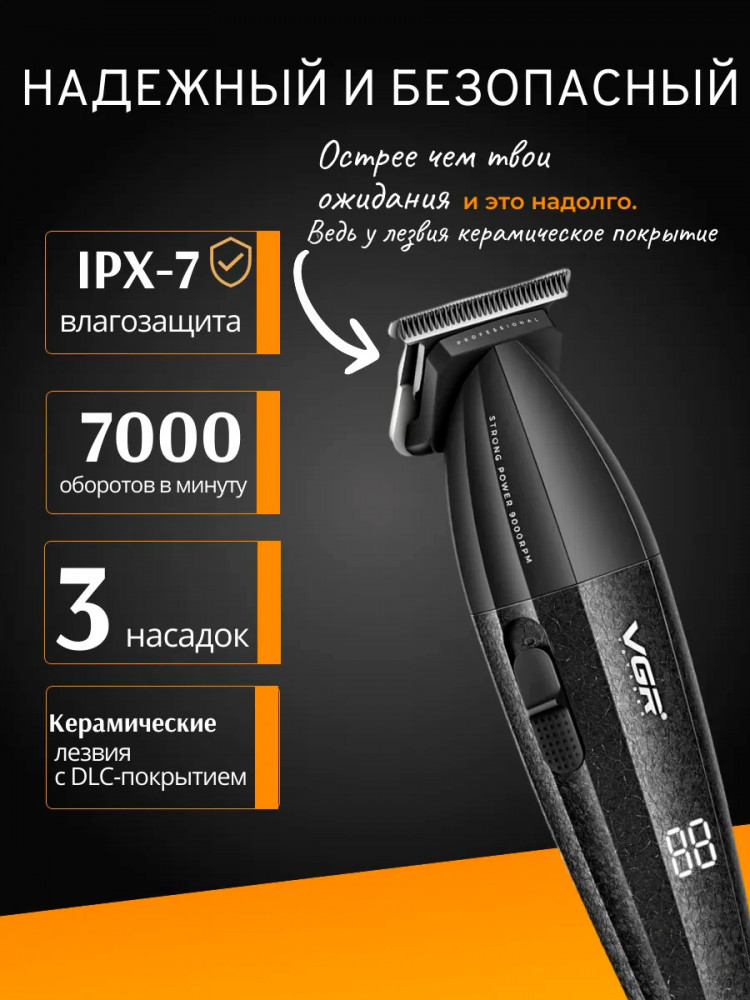💳 Оплатить за товар можно при получении 🇰🇿 Есть бесплатная доставка по Казахстану от 1 дня 🎁 Копите бонусы с каждой покупки Триммер для бритья VGR — идеальный инструмент для современных мужчин, стремящихся к безупречному стилю и ухоженному внешнему виду. Эта мощная и стильная электробритва станет вашим надежным помощником в создании идеальной прически и аккуратной бороды. Полная зарядка занимает всего 2,5 часа, что позволяет вам всегда быть готовым к уходу за собой. Светодиодный индикатор заряда поможет вам контролировать уровень батареи. Триммер выполнен из прочного металла, что гарантирует долговечность и надежность устройства. Влагозащита позволяет легко очищать лезвия и корпус под водой. |