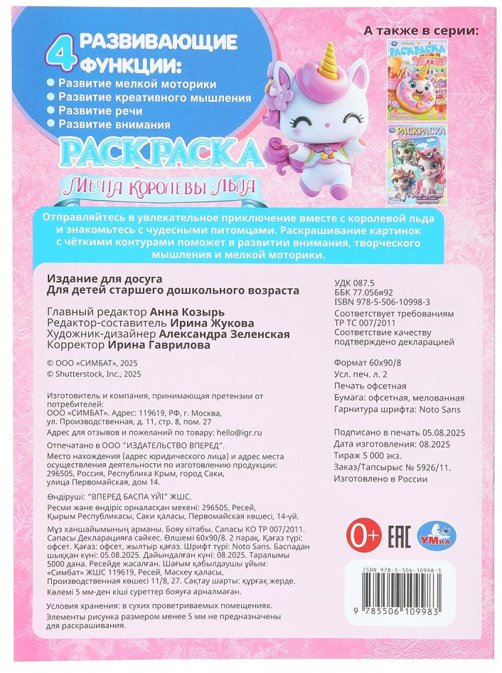 💳 Оплатить за товар можно при получении 🇰🇿 Есть бесплатная доставка по Казахстану от 1 дня 🎁 Копите бонусы с каждой покупки Раскраска «Мечта королевы льда» ТМ «УМка» обязательно понравится юным художникам. Эта занимательная раскраска про очаровательную королеву льда и милых волшебных существ не только скрасит досуг ребёнка, но и поможет потренировать руку к письму. Внутри детей ожидают интересные картинки с чётким контуром и сюжетные тексты к ним. Благодаря удобному формату раскраску можно взять с собой в дорогу. |