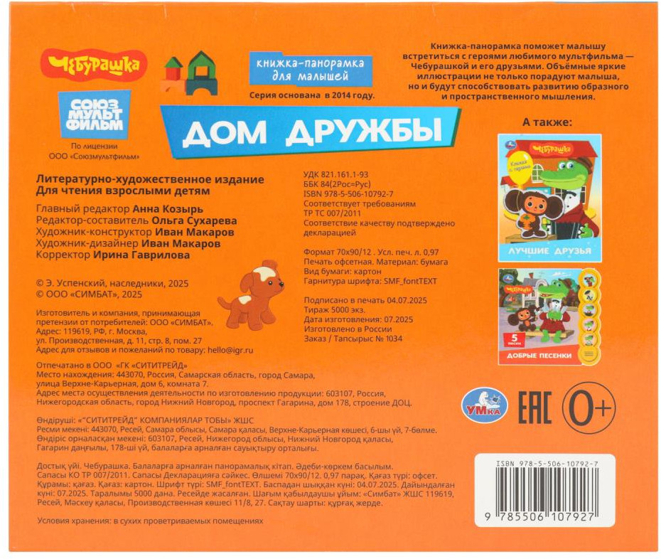💳 Оплатить за товар можно при получении 🇰🇿 Есть бесплатная доставка по Казахстану от 1 дня 🎁 Копите бонусы с каждой покупки Книжка-панорамка «Чебурашка. Дом дружбы» ТМ «УМка» — отличный подарок для маленьких любознаек. Малыш с удовольствием будет листать яркие странички и слушать интересную историю про приключения милого ушастика Чебурашки и его друзей, которая будет «оживать» на глазах благодаря объёмным картинкам. Читая вместе с родителями эту занимательную книгу, ребёнок будет увеличивать свой словарный запас и расширять кругозор. |
