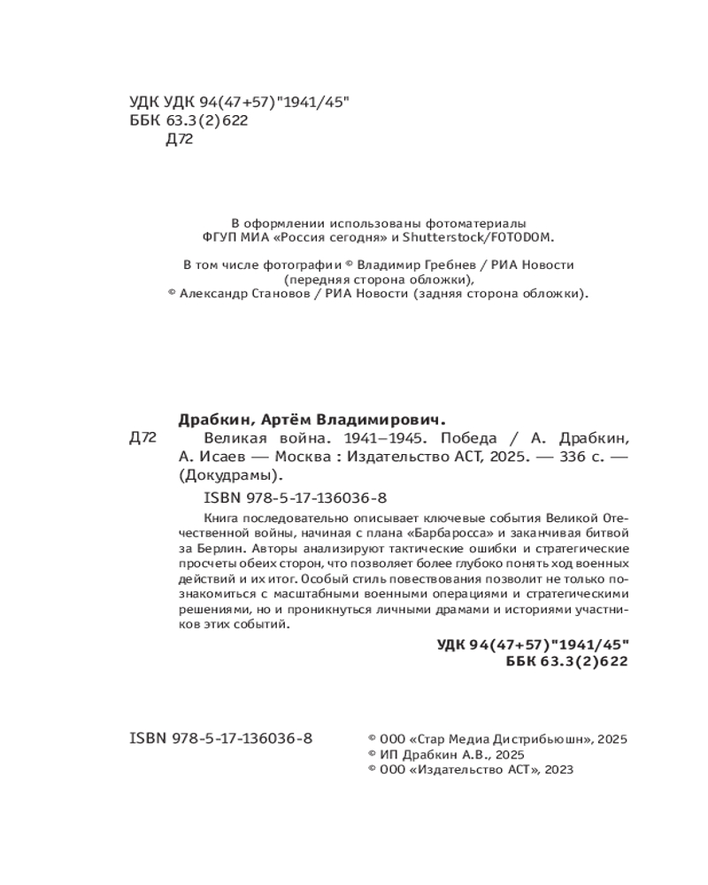 💳 Оплатить за товар можно при получении 🇰🇿 Есть бесплатная доставка по Казахстану от 1 дня 🎁 Копите бонусы с каждой покупки Серия: Докудрамы Эта книга — захватывающий рассказ о событиях Великой Отечественной войны, основанный на популярной докудраме «Великая война» от кинокомпании «Стар Медиа». В ней авторы, крупнейшие специалисты по истории Великой Отечественной войны, Алексей Исаев и Артём Драбкин, отошли от хронологического повествования, сконцентрировавшись на описании сражений на каждом театре военных действий. Такой подход позволил полнее увидеть масштаб исторических событий, показать всю тяжесть войны, героизм советских людей. Книга будет интересна как любителям истории, так и широкой аудитории, интересующейся событиями тех лет. |