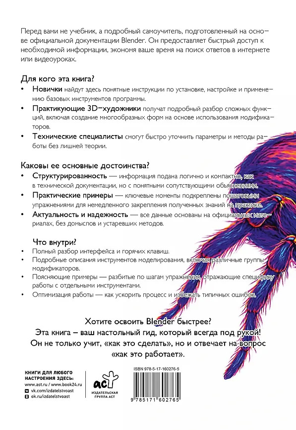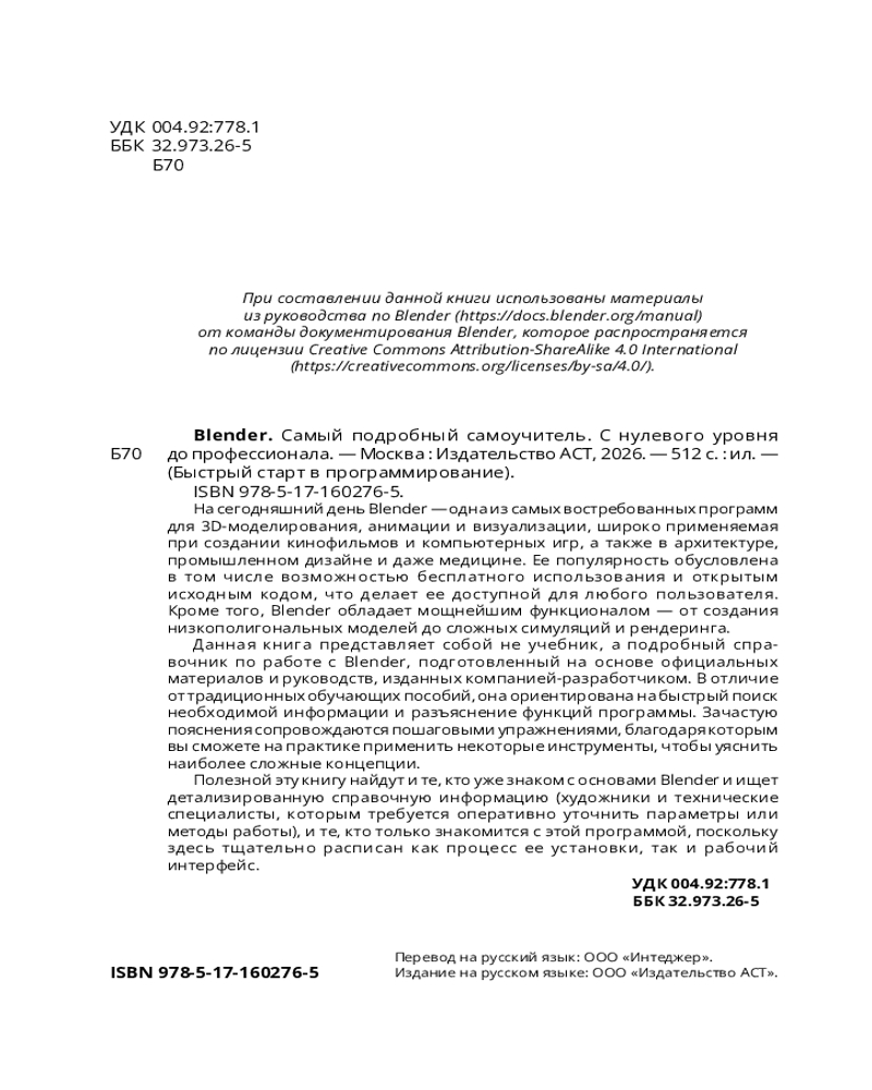 💳 Оплатить за товар можно при получении 🇰🇿 Есть бесплатная доставка по Казахстану от 1 дня 🎁 Копите бонусы с каждой покупки Серия: Учимся программировать На сегодняшний день Blender — одна из самых востребованных программ для 3D-моделирования, анимации и визуализации, широко применяемая при создании кинофильмов и компьютерных игр, а также в архитектуре, промышленном дизайне и даже медицине. Ее популярность обусловлена в том числе возможностью бесплатного использования и открытым исходным кодом, что делает ее доступной для любого пользователя. Кроме того, Blender обладает мощнейшим функционалом — от создания низкополигональных моделей до сложных симуляций и рендеринга. Данная книга представляет собой не учебник, а подробный самоучитель по работе с Blender, подготовленный на основе официальных материалов и руководств, изданных компанией-разработчиком. В отличие от традиционных обучающих пособий, она ориентирована на быстрый поиск необходимой информации и разъяснение функций программы. Зачастую пояснения сопровождаются пошаговыми упражнениями, благодаря которым вы сможете на практике применить некоторые инструменты, чтобы уяснить наиболее сложные концепции. |