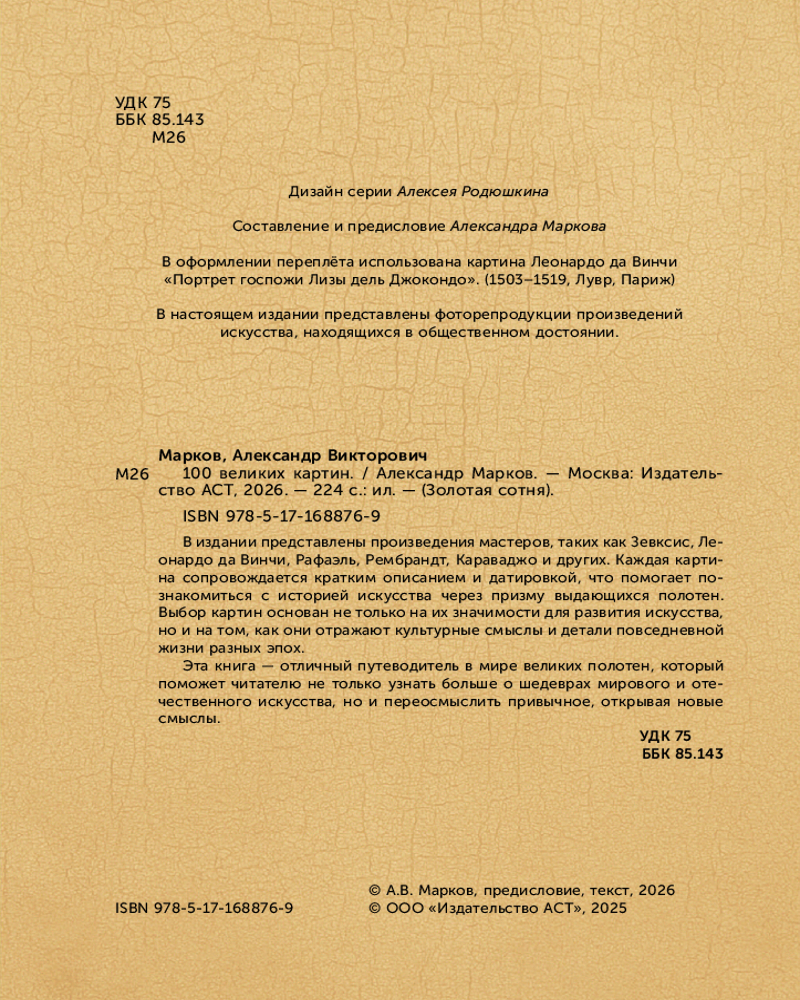 💳 Оплатить за товар можно при получении 🇰🇿 Есть бесплатная доставка по Казахстану от 1 дня 🎁 Копите бонусы с каждой покупки Серия: Золотая сотня В издании представлены произведения мастеров, таких как Зевксис, Леонардо да Винчи, Рафаэль, Рембрандт, Караваджо и других. Каждая картина сопровождается кратким описанием и датировкой, что помогает познакомиться с историей искусства через призму выдающихся полотен. Выбор картин основан не только на их значимости для развития искусства, но и на том, как они отражают культурные смыслы и детали повседневной жизни разных эпох. |