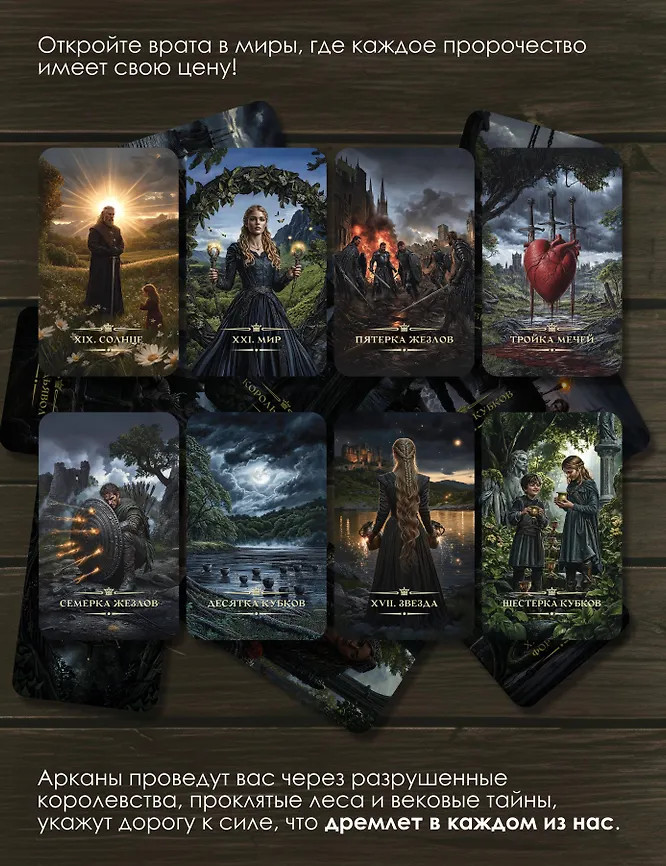 Таро «Тёмное фэнтези»В данный момент этот товар отсутствует в продаже. Возможно, у нас найдется аналогичный или похожий товар здесь. Серия: Легендарное Таро Таро «Темное фэнтези» — колода, в которой архетипы классического Таро обретают плоть в мире, где не утихают войны, не прощаются предательства, а смерть — лишь начало пути. Здесь всё пропитано древней магией, горечью потерь и жаждой власти. Арканы проведут вас через разрушенные королевства, проклятые леса и вековые тайны, укажут дорогу к силе, что дремлет в каждом из нас. Придворные фигуры — не просто персонажи: это предатели и герои, ведьмы, правители, изгнанники и охотники на монстров. |