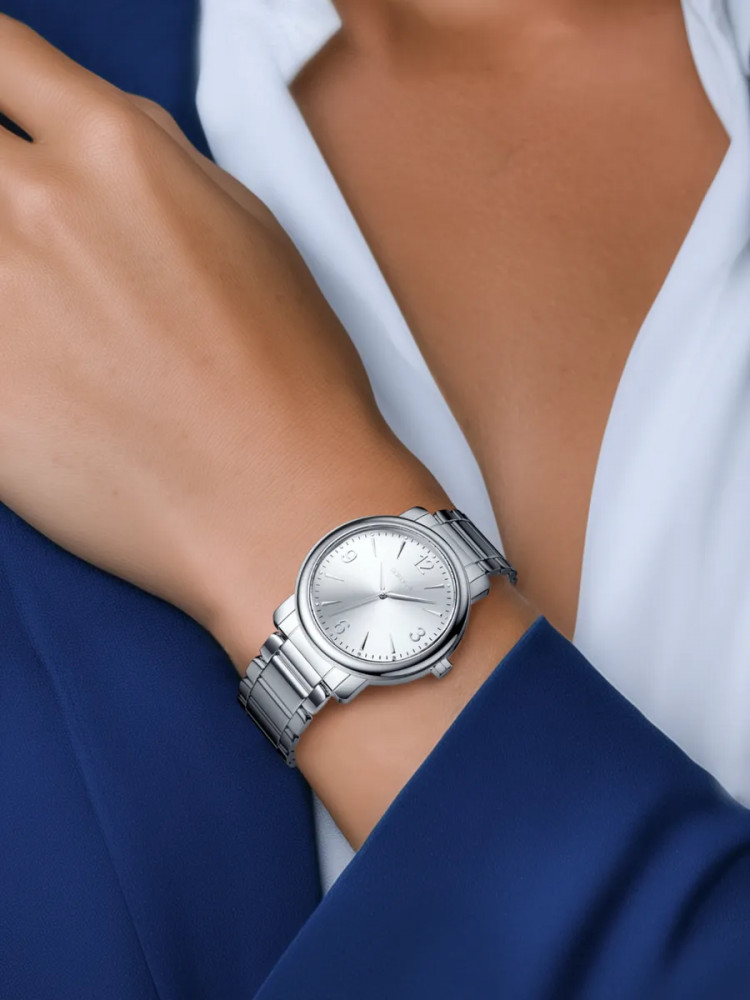 Часы женские наручные стальные коллекция I want. Корпус, задняя крышка, браслет нержавеющая гипоаллергенная сталь 316L, кварцевый японский механизм TMI (Seiko) PC21J, стекло минеральное. Водонепроницаемость 3 АТМ. Диаметр корпуса 34 мм, ширина браслета 16 мм.