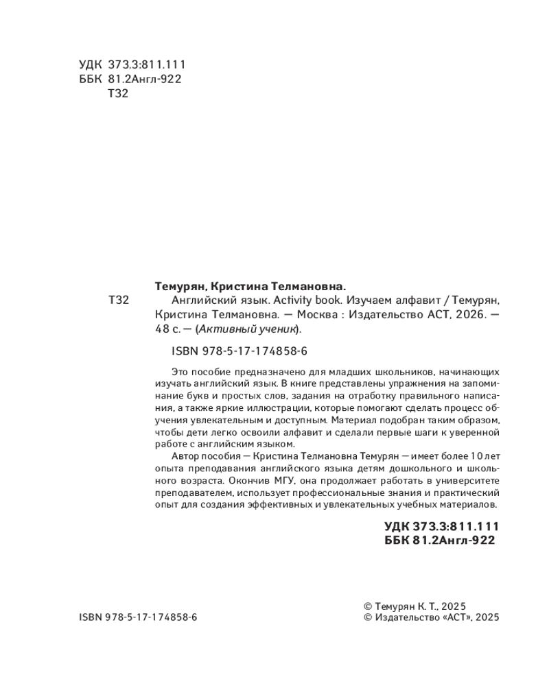 💳 Оплатить за товар можно при получении 🇰🇿 Есть бесплатная доставка по Казахстану от 1 дня 🎁 Копите бонусы с каждой покупки Серия: Активный ученик Это пособие предназначено для младших школьников, начинающих изучать английский язык. В книге представлены упражнения на запоминание букв и простых слов, задания на отработку правильного написания, а также яркие иллюстрации, которые помогают сделать процесс обучения увлекательным и доступным. Материал подобран таким образом, чтобы дети легко освоили алфавит и сделали первые шаги к уверенной работе с английским языком. |