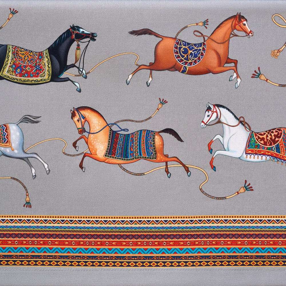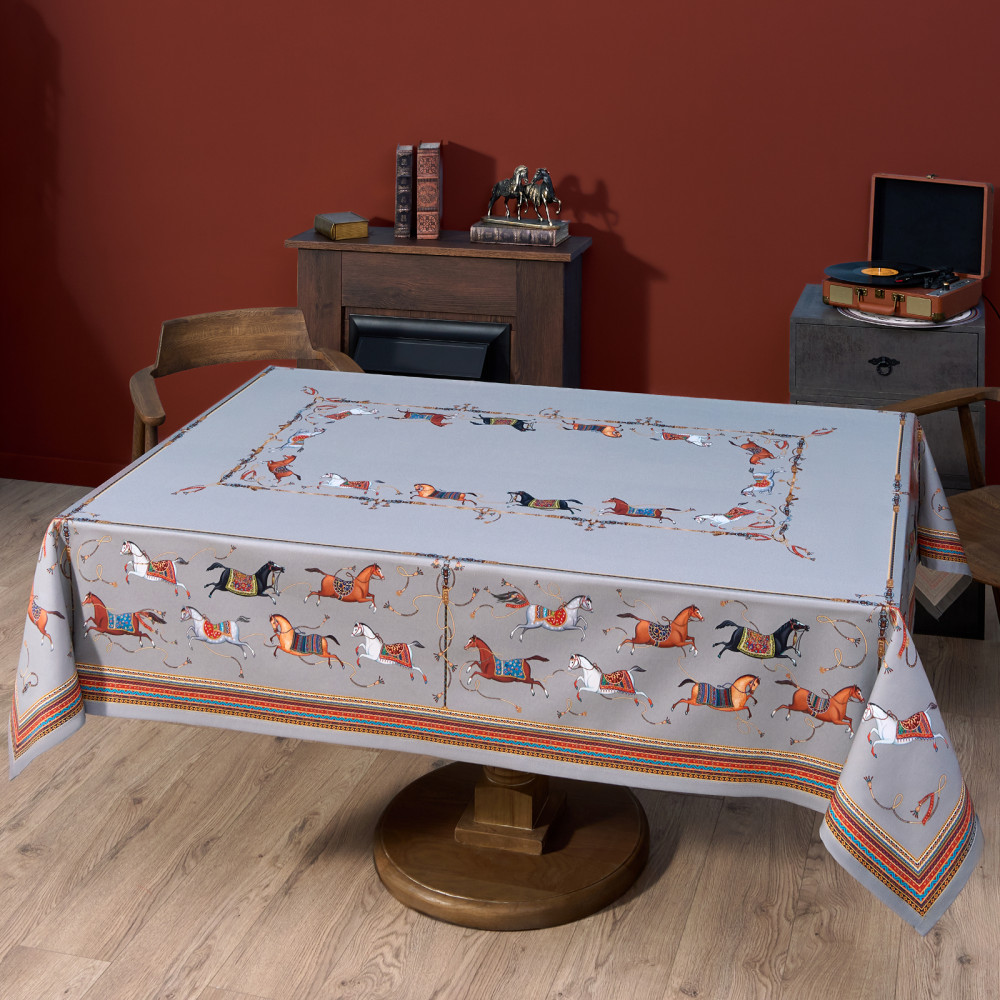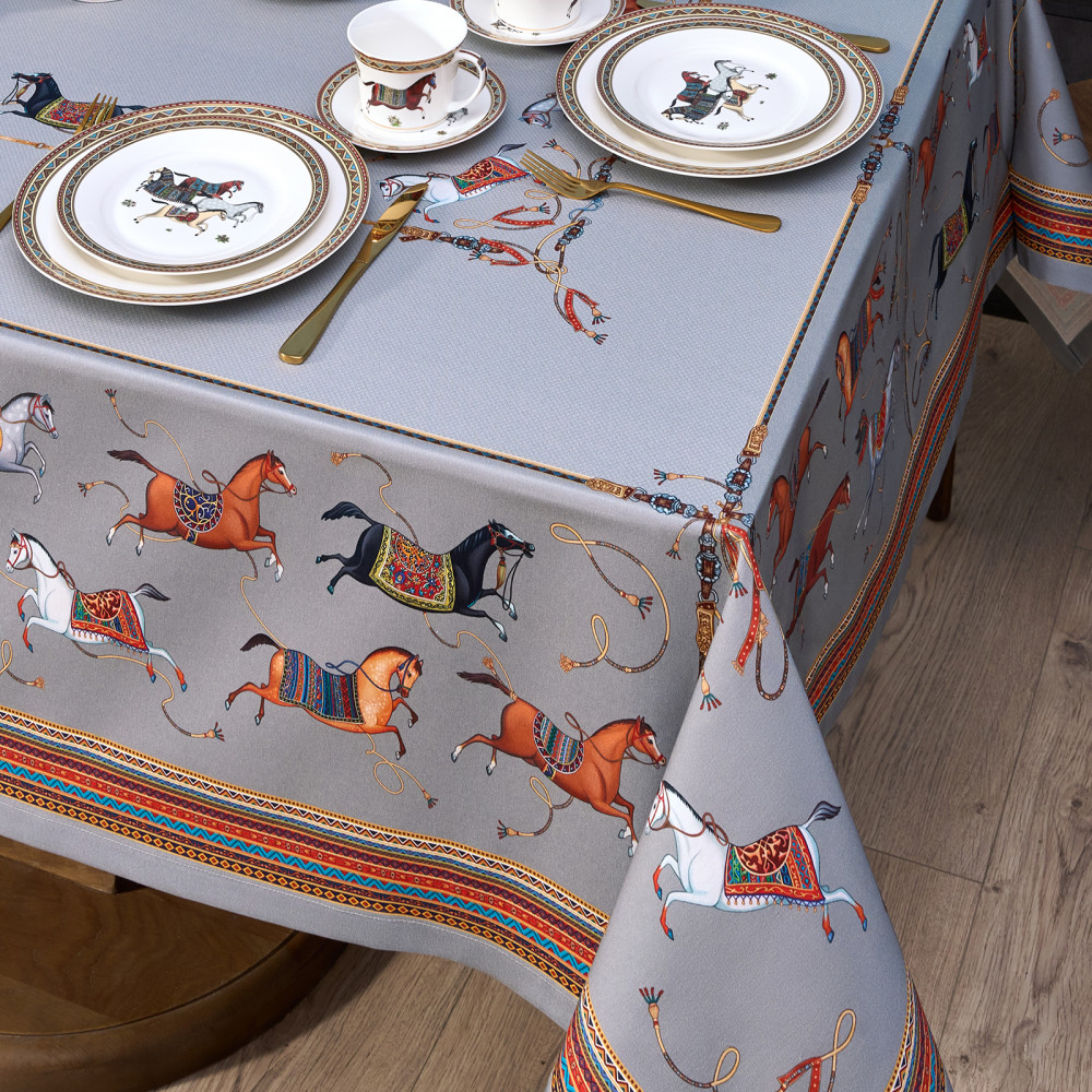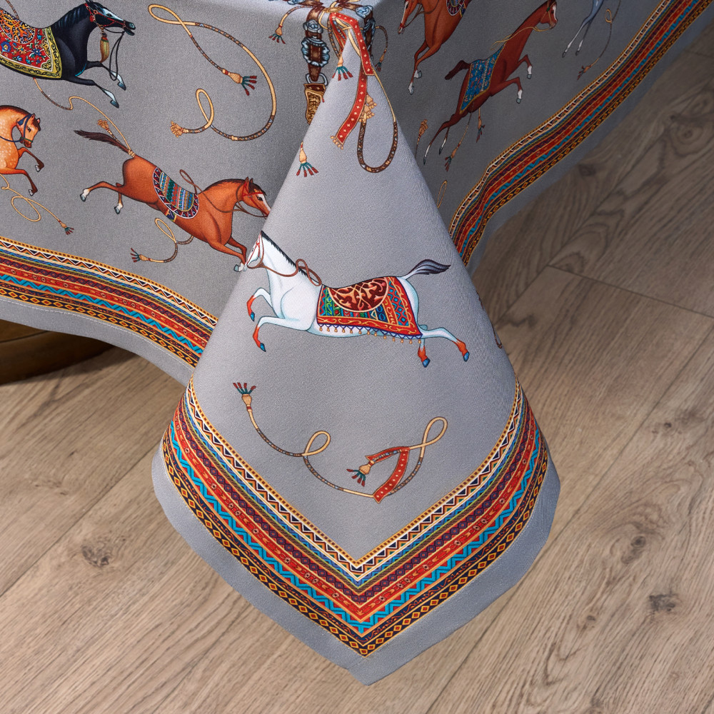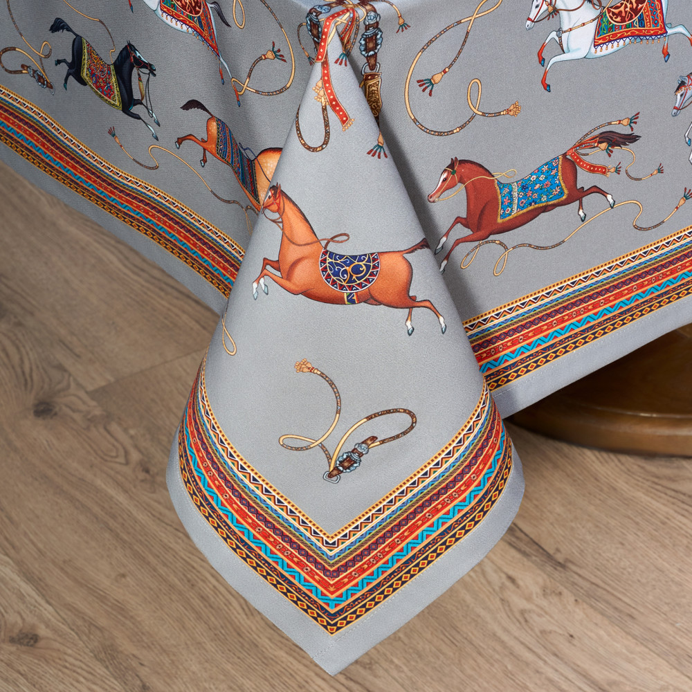 Благородный фон украшен орнаментом с грациозными лошадьми, создавая атмосферу восточной роскоши. Лошадь — символ 2026 года, поэтому скатерть будет актуальна как для ежедневного использования в интерьере в стиле бохо, так и для праздничной сервировки. Авторский принт разработан художниками эксклюзивно для Lefard и нанесён методом цифровой печати, что гарантирует яркость и стойкость красок даже после множества стирок. Производство находится в России, мы относимся с любовью к каждому товару, ровные и аккуратные швы порадуют Вас. Мы рады производить текстиль высокого качества. Новогодняя скатерть станет выразительным акцентом праздничной сервировки и отличным подарком на Новый год, Рождество или новоселье. Такой текстиль порадует маму, бабушку, сестру, подругу или коллегу — красивое изделие для дома всегда символизирует внимание и заботу. В коллекцию Passage входят: дорожки на стол, скатерти круглые, прямоугольные и овальные, кухонные полотенца и сервировочные салфетки. Все предметы дополняют друг друга и помогают создать уютный интерьер.