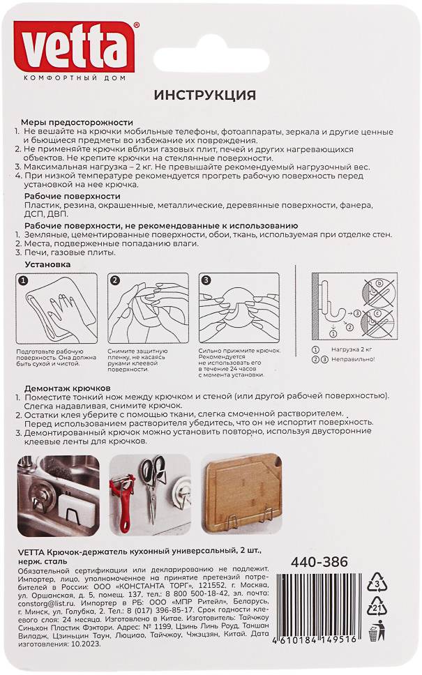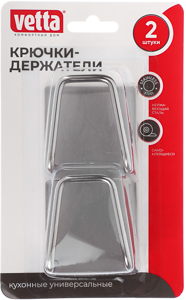 Универсальные крючки-держатели Vetta из нержавеющей стали идеально подойдут для организации вашего пространства. В наборе идут 2 крючка. Они выдерживают до 2 кг веса, что позволяет использовать их для различных нужд, от хранения чашек и тарелок до организации инструментов и аксессуаров. Преимущества: больше не нужно сверлить стены, чтобы зафиксировать держатель для аксессуаров; простая установка в ванной и на кухне без дрели и шуруповерта за пару минут; идеальный вариант для тех, кто не хочет портить новый ремонт; не надо просить мужа или вызывать мастера — справится даже ребенок; материал — надежный металл, который не гнется под весом кухонного/банного текстиля.