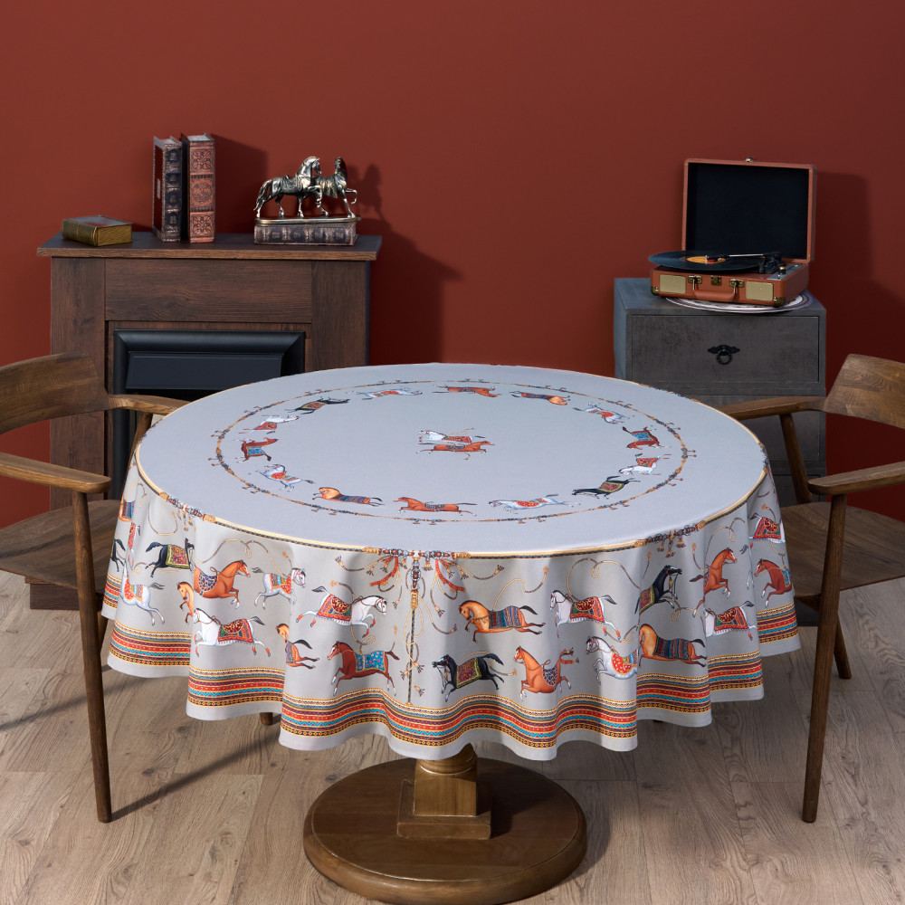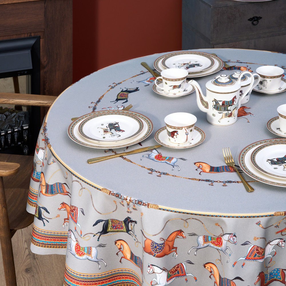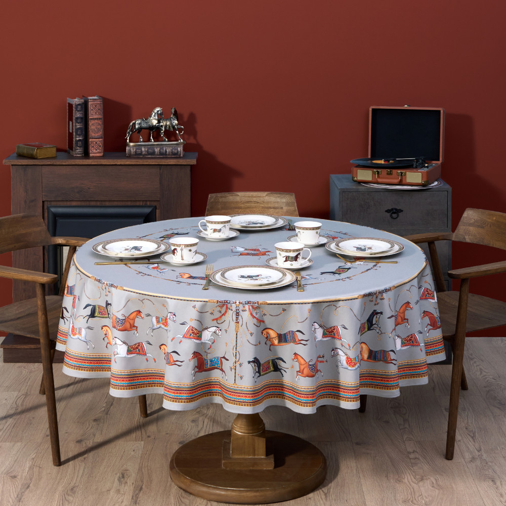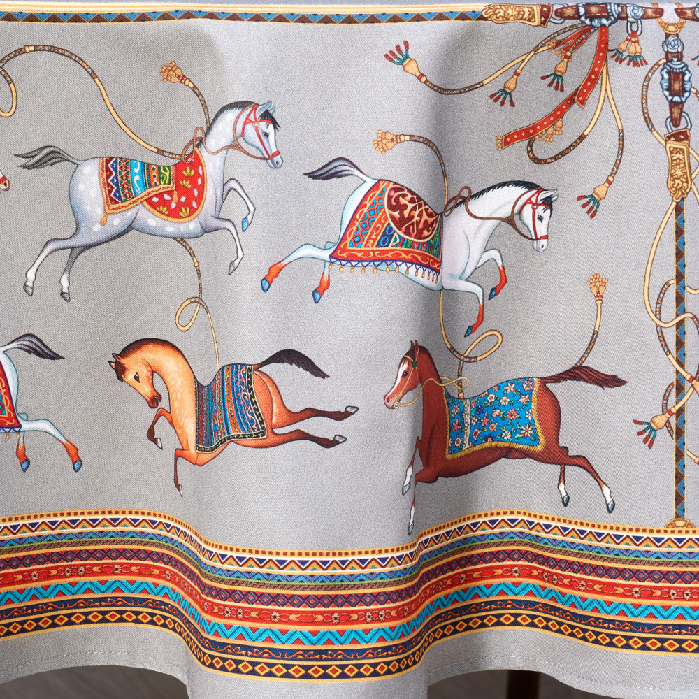 Фон украшен авторским орнаментом с изящными лошадьми — символом 2026 года. Такой принт делает скатерть особенно уместной для праздничной сервировки и стильным украшением интерьера. Рисунок разработан художниками Lefard и нанесён методом цифровой печати, что обеспечивает стойкость красок даже после множества стирок. В коллекции также представлены текстильные аксессуары — кухонные полотенца, дорожки и сервировочные салфетки с таким же принтом Passage. Для завершённой сервировки стол можно дополнить фарфоровой посудой Lefard с аналогичным дизайном. Соберите комплект в едином стиле — для эффектной подачи и создания праздничной атмосферы.