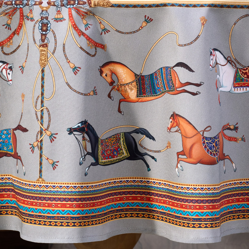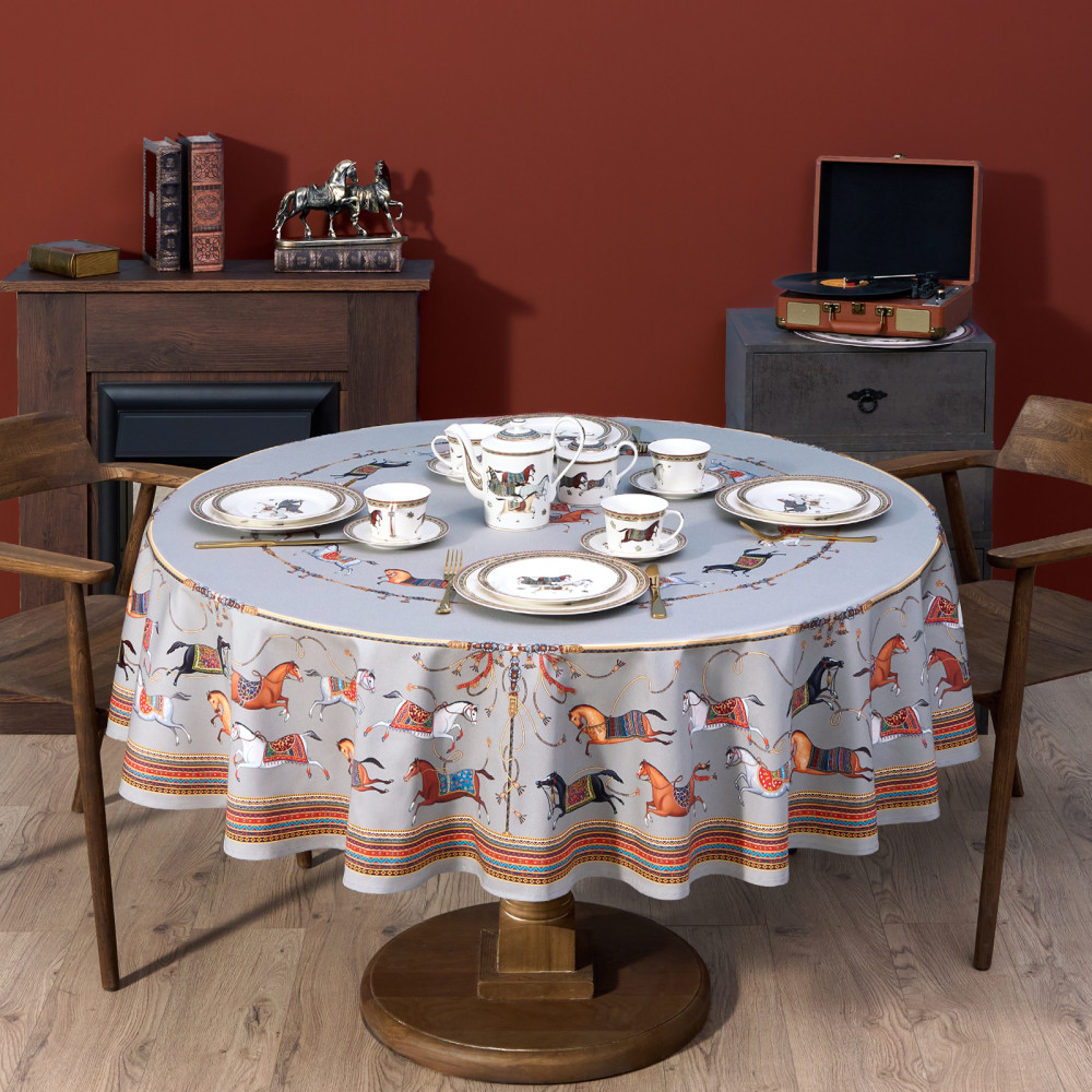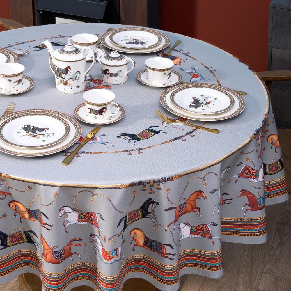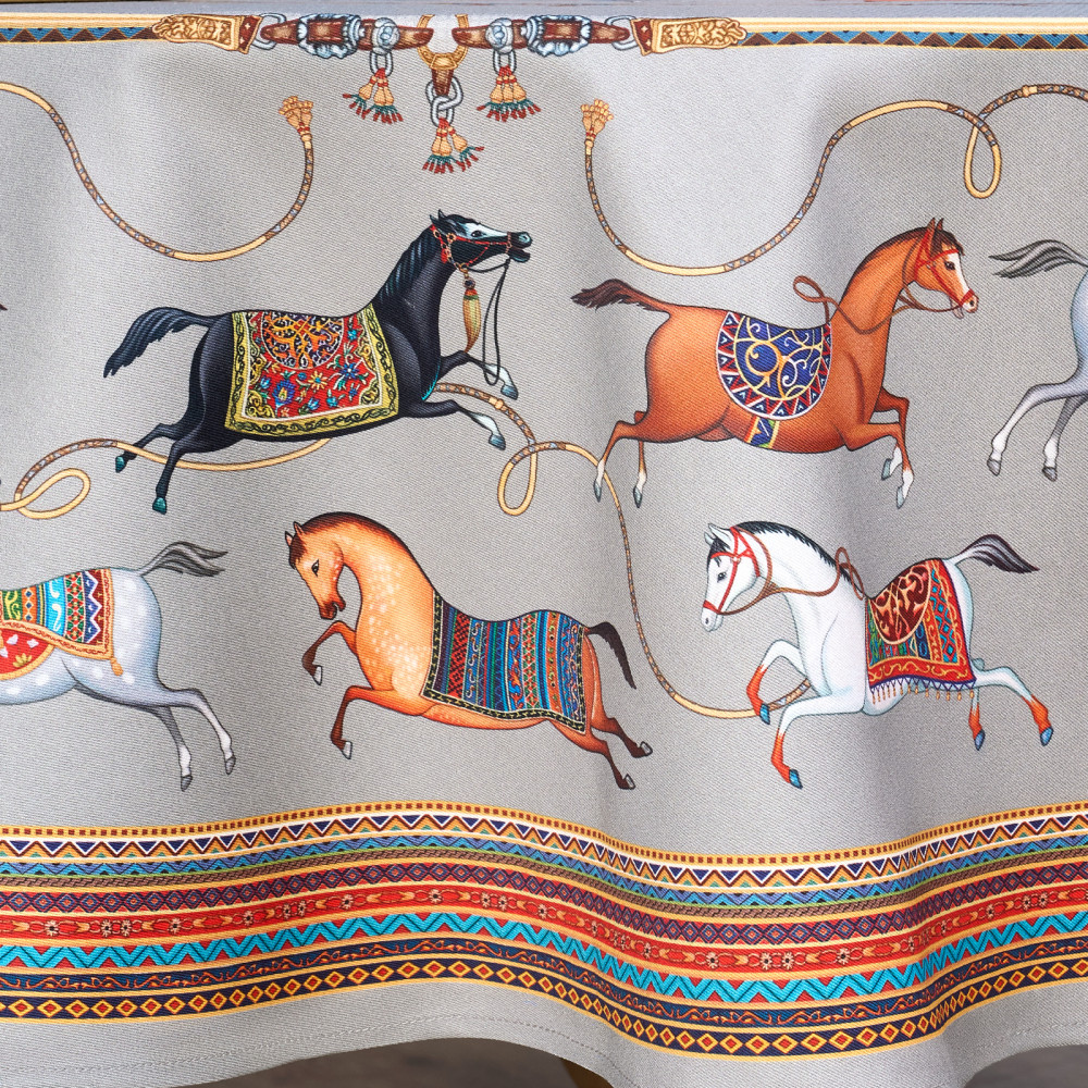 Фон украшен авторским орнаментом с изящными лошадьми — символом 2026 года. Такой принт делает скатерть особенно уместной для праздничной сервировки и стильным украшением интерьера. Рисунок разработан художниками Lefard и нанесён методом цифровой печати, что обеспечивает стойкость красок даже после множества стирок. В коллекции также представлены текстильные аксессуары — кухонные полотенца, дорожки и сервировочные салфетки с таким же принтом Passage. Для завершённой сервировки стол можно дополнить фарфоровой посудой Lefard с аналогичным дизайном. Соберите комплект в едином стиле — для эффектной подачи и создания праздничной атмосферы.