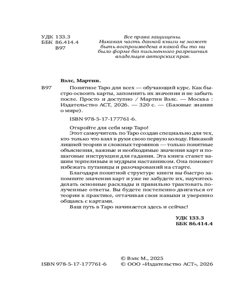 💳 Оплатить за товар можно при получении 🇰🇿 Есть бесплатная доставка по Казахстану от 1 дня 🎁 Копите бонусы с каждой покупки Серия: Базовые знания о мире Откройте для себя мир Таро! Этот самоучитель по Таро создан специально для тех, кто только что взял в руки свою первую колоду Уэйта. Никакой лишней теории и сложных терминов — только понятные объяснения, практические упражнения и пошаговые инструкции. Эта книга станет вашим терпеливым и мудрым наставником. Она поможет избежать путаницы и разочарований на старте. |