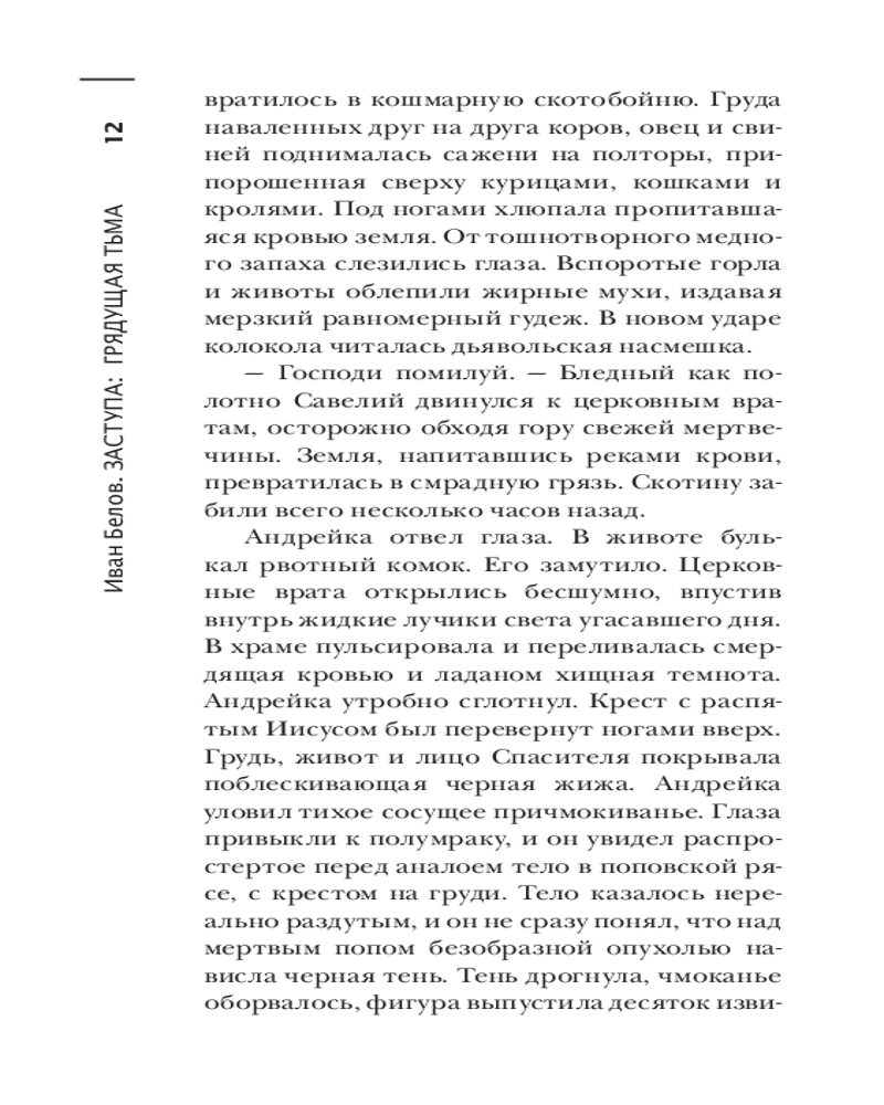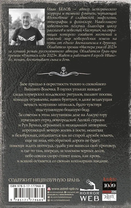 Самая страшная книга. Заступа. Грядущая тьмаВ данный момент этот товар отсутствует в продаже. Возможно, у нас найдется аналогичный или похожий товар здесь. Серия: Самая страшная книга Злое пришло в окрестности тихого и спокойного Вышнего Волочка. В глухих уголках находят следы изуверских колдовских ритуалов, пылают посевы, колодцы отравлены, мавки бунтуют, и даже вездесущая нечисть испуганно затаилась, будто чувствуя подступающую большую беду. За советом в этом запутанном деле на Лысую гору приезжает отряд новгородской Лесной стражи, и Рух Бучила, скромный и нелюдимый затворник, коротающий вечную жизнь в посте, молитвах и безобразиях, соглашается им по старой дружбе помочь, еще не зная, что обратной дороги не будет, помощи ждать неоткуда, судьба уже вынесла свой приговор и где-то там, впереди, за изломом черных лесов, небо совсем скоро станет алым, как кровь, и всякий останется со своими кошмарами наедине. |