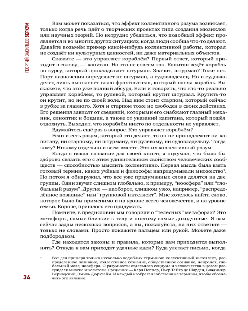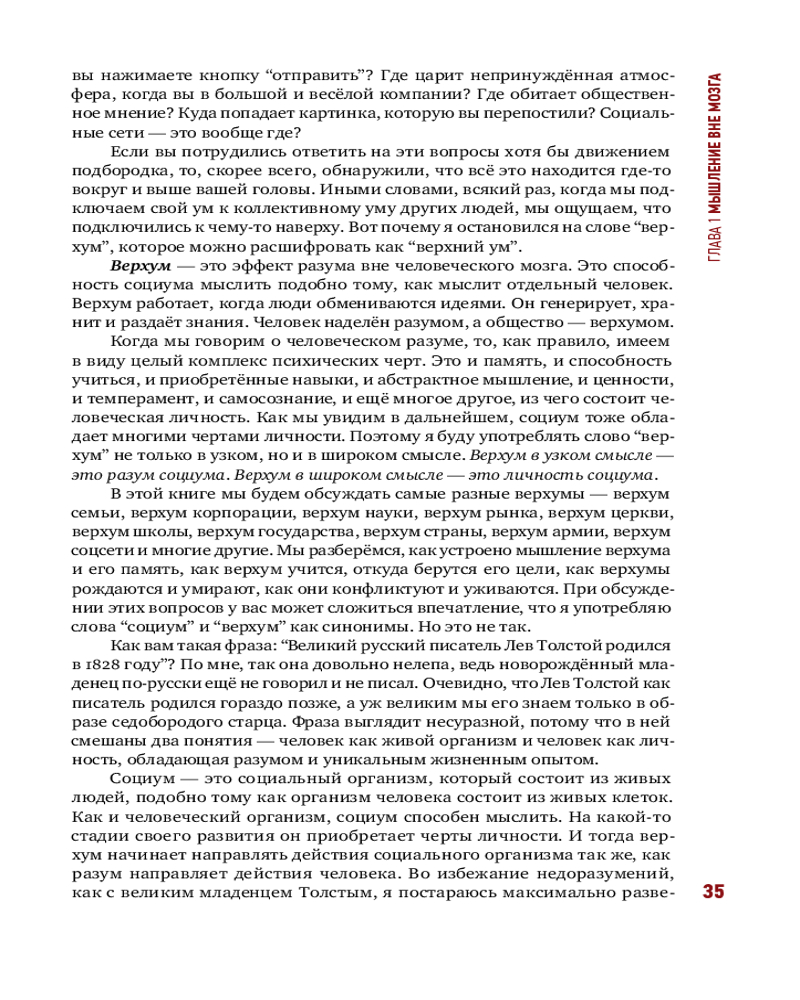 💳 Оплатить за товар можно при получении 🇰🇿 Есть бесплатная доставка по Казахстану от 1 дня 🎁 Копите бонусы с каждой покупки Серия: Corpus. Семья решила… Государство требует… Рынок отреагировал… Наука считает… Во всех этих фразах действующие лица — не люди. Но мы говорим о семье, о государстве, о рынке, о науке так, будто они и вправду думают и принимают решения. Эта книга о том, как мыслит социум. Верхум можно расшифровать как «верхний ум», то есть мышление вне мозга. В узком смысле верхум — это разум социума, в широком смысле — его личность. Верхумом обладают и парламент, и армия, и рынок, и наука, и маленькая семья, и человечество в целом. |