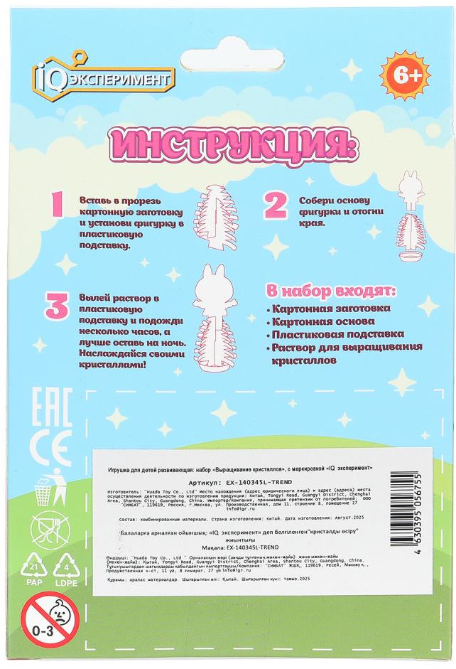 IQ Эксперимент Набор для опытов «Весёлые монстрики»В данный момент этот товар отсутствует в продаже. Возможно, у нас найдется аналогичный или похожий товар здесь. Набор для опытов «Весёлые монстрики» из серии «Выращивание кристаллов» ТМ «IQ Эксперимент» непременно понравится юному любознайке. Набор для выращивания кристаллов — это увлекательный способ познакомиться с основами химии и физики, наблюдая за удивительным процессом кристаллизации. Из входящих в состав набора предметов нужно собрать фигурку и установить её в пластиковую подставку. Останется лишь вылить в подставку специальный раствор и подождать несколько часов: конструкция начнёт обрастать кристалликами, а через 24 часа закристаллизуется по максимуму, превратившись в волшебную инсталляцию, верхушку которой будет украшать картонная фигурка невероятно милого улыбающегося монстрика. Занятие с набором для опытов ТМ «IQ Эксперимент» пробуждает интерес к науке и развивает: внимание, усидчивость, аккуратность и воображение. |