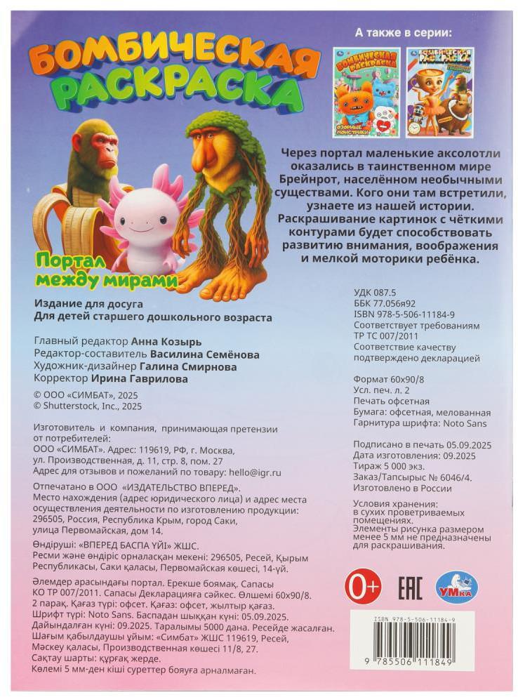 💳 Оплатить за товар можно при получении 🇰🇿 Есть бесплатная доставка по Казахстану от 1 дня 🎁 Копите бонусы с каждой покупки Серия: Бомбическая раскраска Бомбическая раскраска «Портал между мирами» ТМ «УМка» обязательно понравится юным художникам. Эта занимательная раскраска про удивительный портал между мирами — миром милых животных и миром необычных существ — не только скрасит досуг ребёнка, но и поможет потренировать руку к письму. Внутри детей ожидают интересные картинки с чётким контуром и сюжетные тексты к ним. Благодаря удобному формату раскраску можно взять с собой в дорогу. |