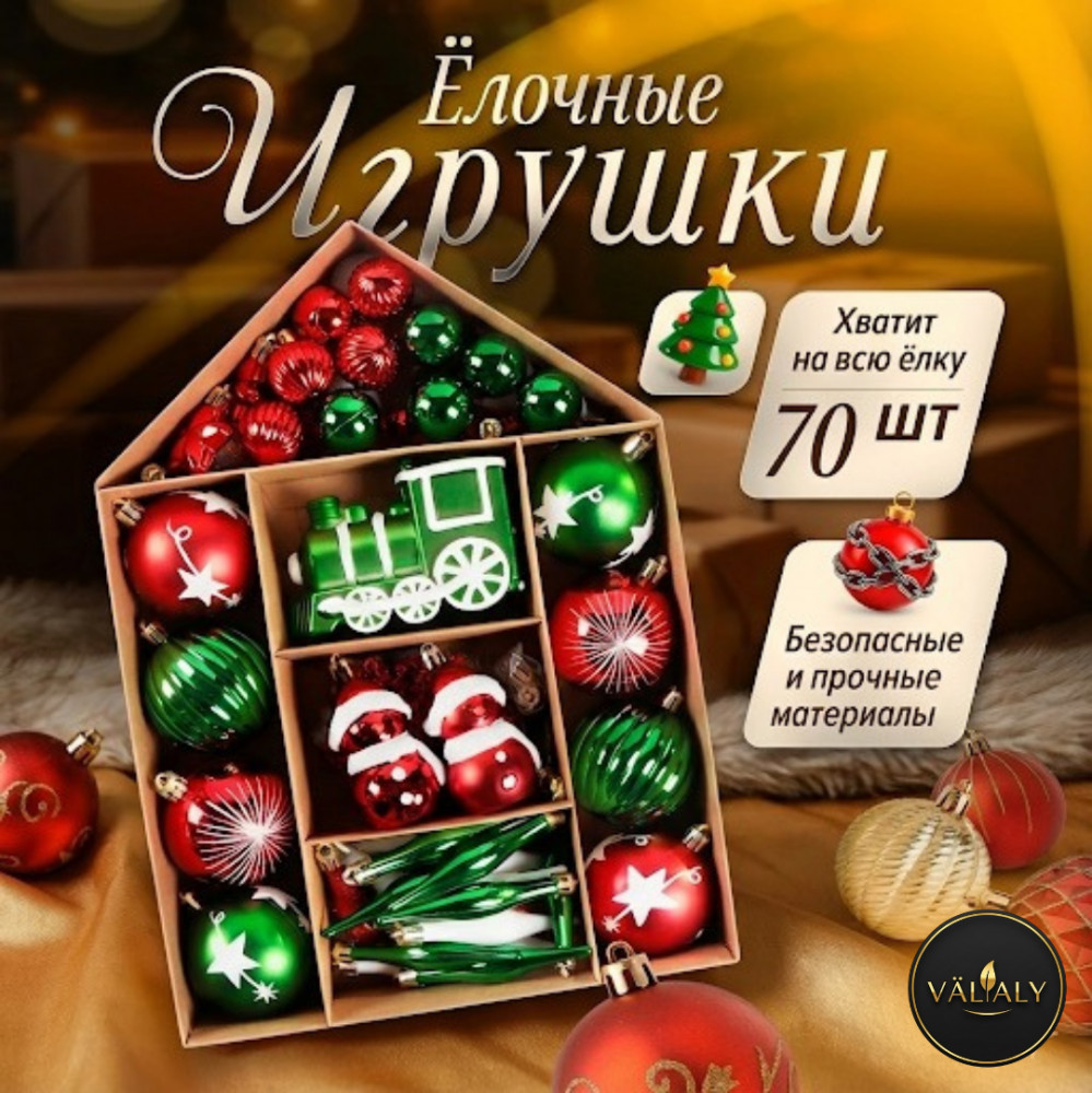 Создайте сказку на вашей ёлке одним набором! Готовитесь к Новому году и хотите, чтобы ваша елка выглядела стильно, богато и гармонично? Набор елочных украшений от бренда VÄLYALY — это готовое решение для идеального праздничного декора. Вам больше не нужно подбирать игрушки по отдельности — мы собрали всё самое лучшее в одной волшебной коробке!