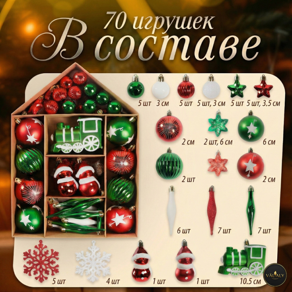 • изобилие в одной коробке (70 предметов): такого количества игрушек хватит, чтобы полностью нарядить стандартную ёлку от макушки до нижних ветвей. Ёлка будет выглядеть пышно и нарядно со всех сторон;
