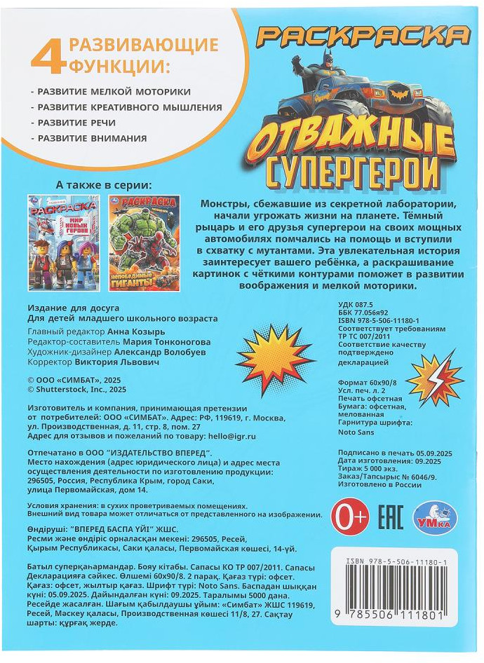 💳 Оплатить за товар можно при получении 🇰🇿 Есть бесплатная доставка по Казахстану от 1 дня 🎁 Копите бонусы с каждой покупки Раскраска «Отважные супергерои» ТМ «УМка» — отличный подарок для юных художников. Эта увлекательная раскраска про крутых супергероев непременно понравится вашему ребёнку. В ней он найдёт интересные картинки с чёткими контурами и сюжетными текстами к ним. Данное издание станет отличным вариантом, чтобы взять его с собой в путешествие и скоротать время в дороге за раскрашиванием. |